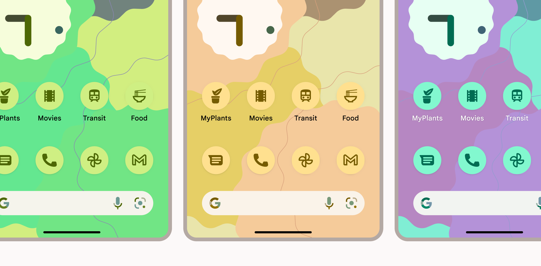 I temi creati dagli utenti sono supportati dal colore dinamico, che abbiamo reso disponibile con Material You a partire da Android 12. Se è attivata, il colore dinamico ricava i colori personalizzati dallo sfondo di un utente per applicarli alle app e all'interfaccia utente di sistema. Questa tavolozza dei colori viene utilizzata come punto di partenza per generare combinazioni di colori chiare e scure.