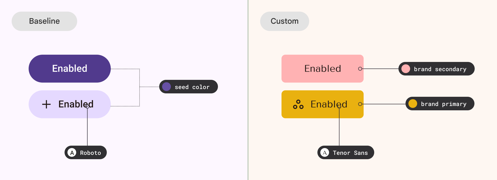 - Puoi personalizzare una combinazione di colori per una maggiore espressività. Se utilizzi Generatore di temi Material per creare uno schema, viene creato automaticamente uno schema scuro. Scopri di più sulla personalizzazione di Material e del sistema di colori per creare un tema con il tuo brand.