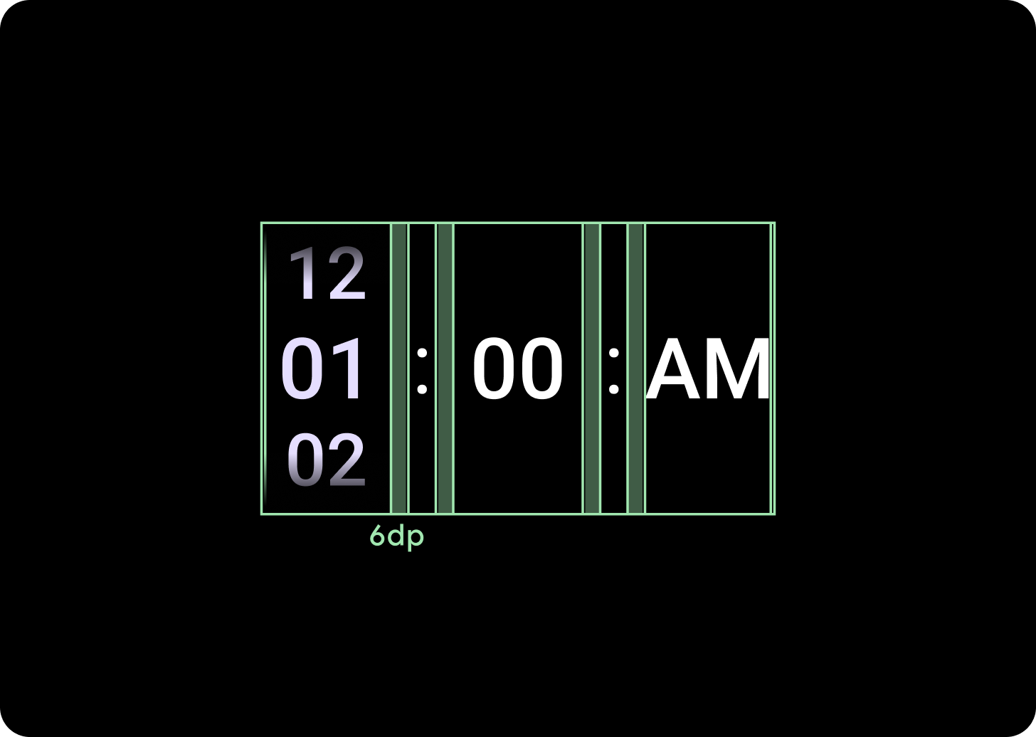 選択ツール グループは、使用可能な高さと幅に収まるように配置されます。選択ツールの列には、4 つのレイアウト オプションがあります。各レイアウトは中央に配置され、使用可能な高さいっぱいに表示されます。列の幅は、フォントで必要な桁数に対応するために必要な幅で定義されます。日付選択ツールは例外で、横方向に画面全体を占有し、端からはみ出します。