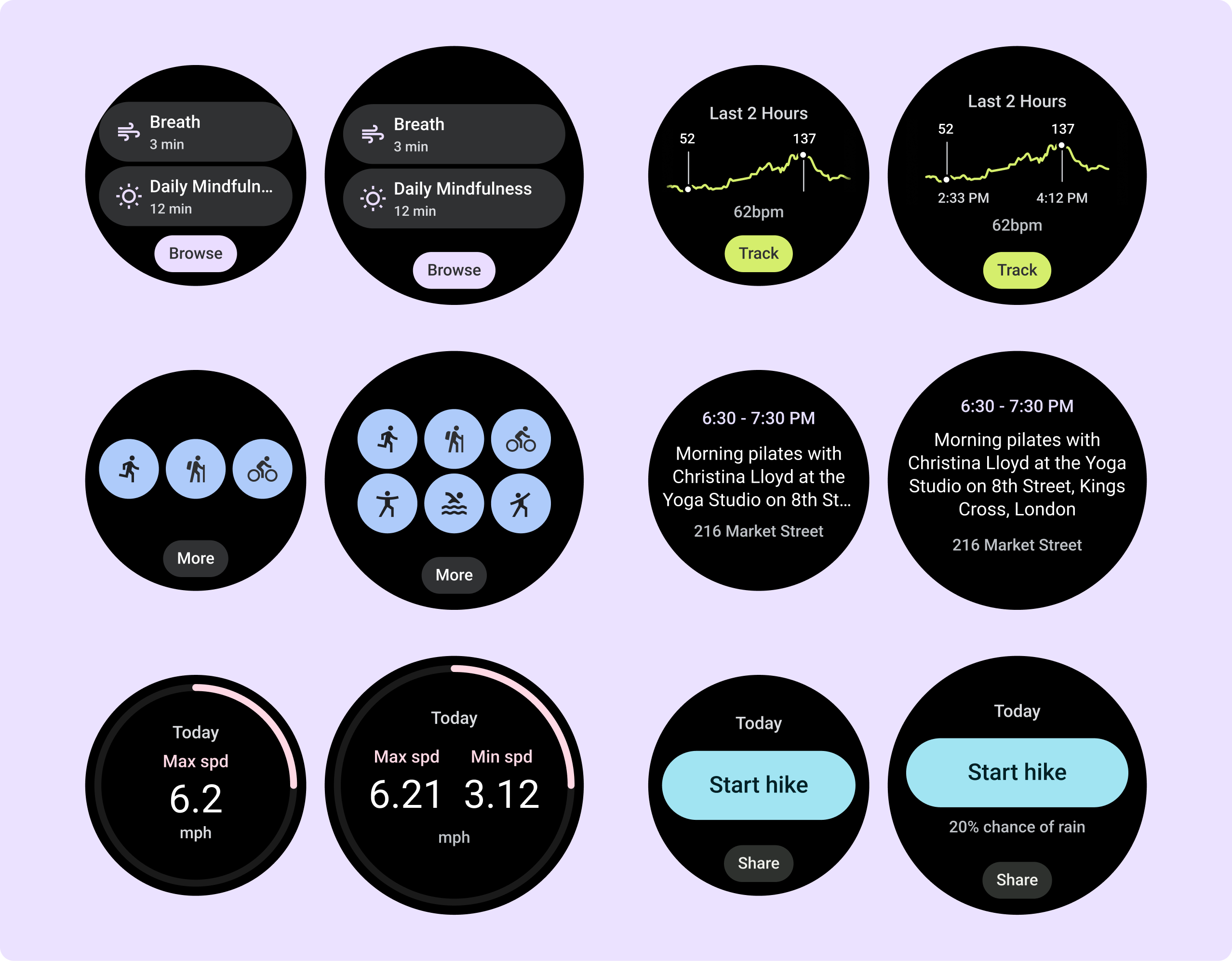 Non-scrolling layouts are customizable, but are more limited in how much content can be added to the screen and what kind of components work best. Using IconButtons instead of Chips makes better use of the limited space, and visual graphics like ProgressIndicators and large data points help communicate key information in a graphical way.