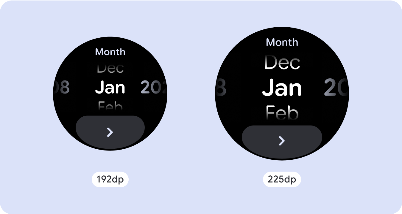 Pour les conceptions d'écran uniques, effectuez des tests approfondis sur différentes tailles d'écran, en vous assurant que les composants et les éléments s'adaptent facilement et en évitant le recadrage du contenu. Nos marges en pourcentage aident les espaces à s'adapter efficacement. Nous vous recommandons d'utiliser un point d'inflexion à 225 dp pour ajouter des informations supplémentaires et améliorer les fonctionnalités sur les écrans de montre plus grands.