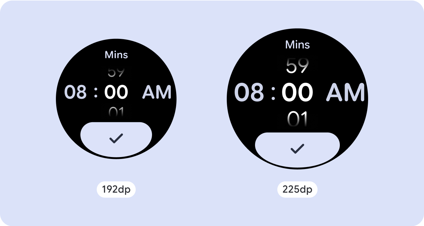 Untuk desain layar yang unik, uji secara menyeluruh di berbagai ukuran layar, untuk memastikan komponen dan elemen beradaptasi dengan lancar dan menghindari pemotongan konten. Margin persentase kami membantu pengatur jarak diskalakan secara efektif, dan sebaiknya gunakan titik henti sementara di 225dp untuk memperkenalkan informasi tambahan dan fungsi yang ditingkatkan di layar smartwatch yang lebih besar.