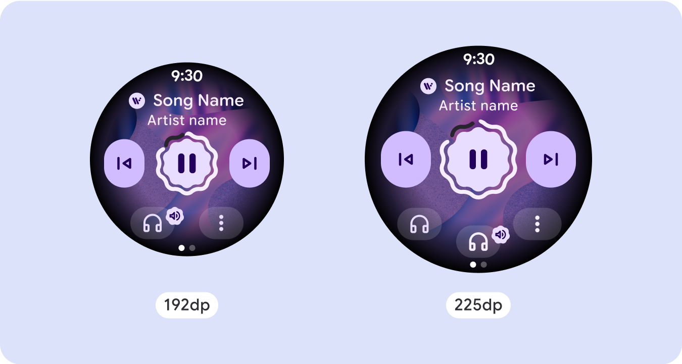 สำหรับการออกแบบหน้าจอที่ไม่ซ้ำกัน ให้ทดสอบอย่างละเอียดในหน้าจอขนาดต่างๆ เพื่อให้แน่ใจว่าคอมโพเนนต์และองค์ประกอบต่างๆ จะปรับขนาดได้อย่างราบรื่นและหลีกเลี่ยงการครอบตัดเนื้อหา ส่วนต่างของเปอร์เซ็นต์ช่วยให้ตัวเว้นวรรคปรับขนาดได้อย่างมีประสิทธิภาพ และเราขอแนะนำให้ใช้จุดแบ่งที่ 225dp เพื่อแสดงข้อมูลเพิ่มเติมและฟังก์ชันการทำงานที่มีประสิทธิภาพมากขึ้นบนหน้าจอนาฬิกาขนาดใหญ่
