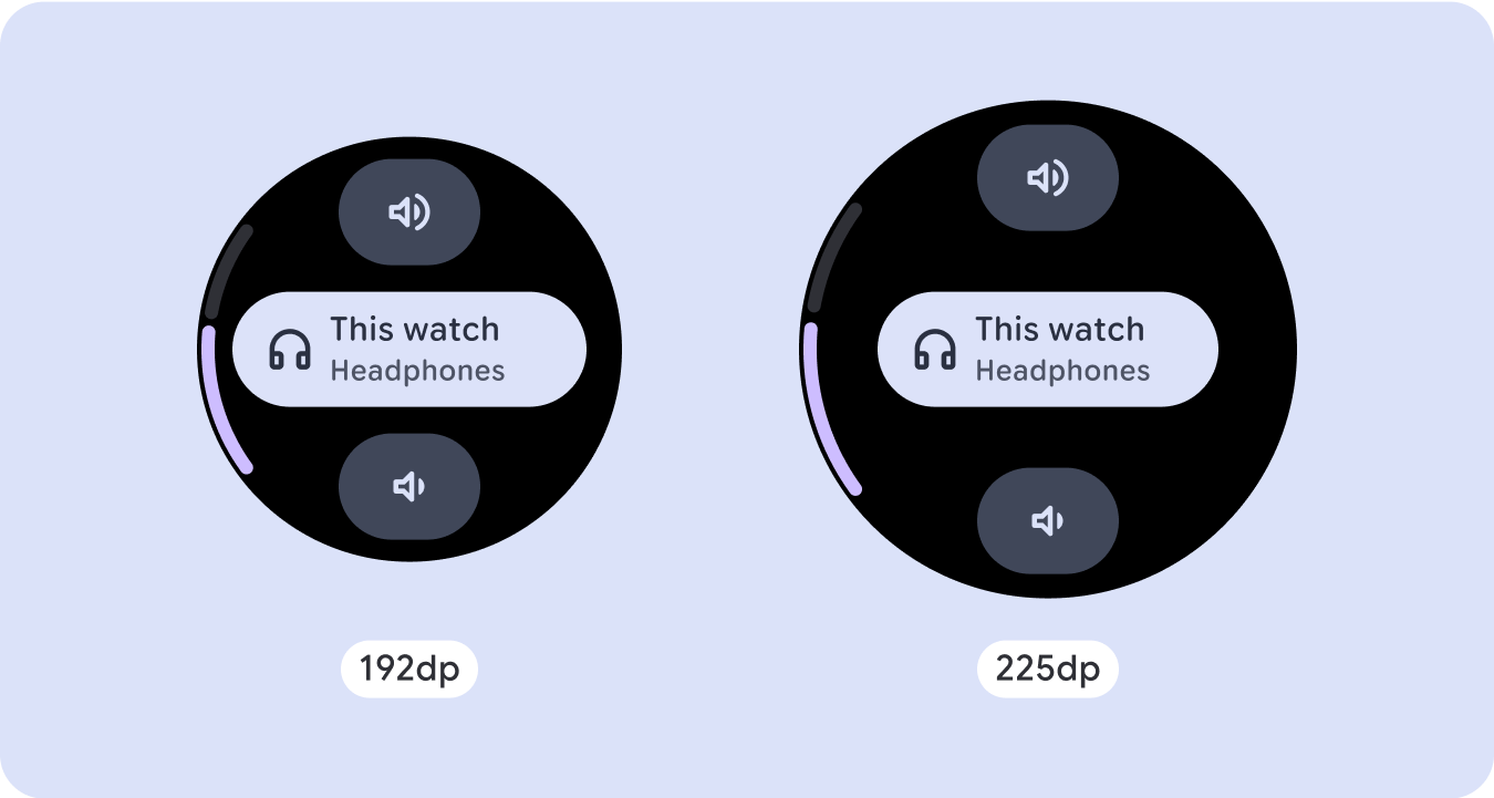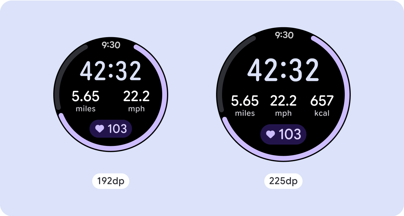 对于独特的屏幕设计,请在各种屏幕尺寸上进行全面测试,确保组件和元素能够顺畅自适应,并避免内容被剪裁。百分比边距有助于有效缩放分隔符,我们建议在 225dp 处使用断点,以便在较大的手表屏幕上显示更多信息和增强功能。
