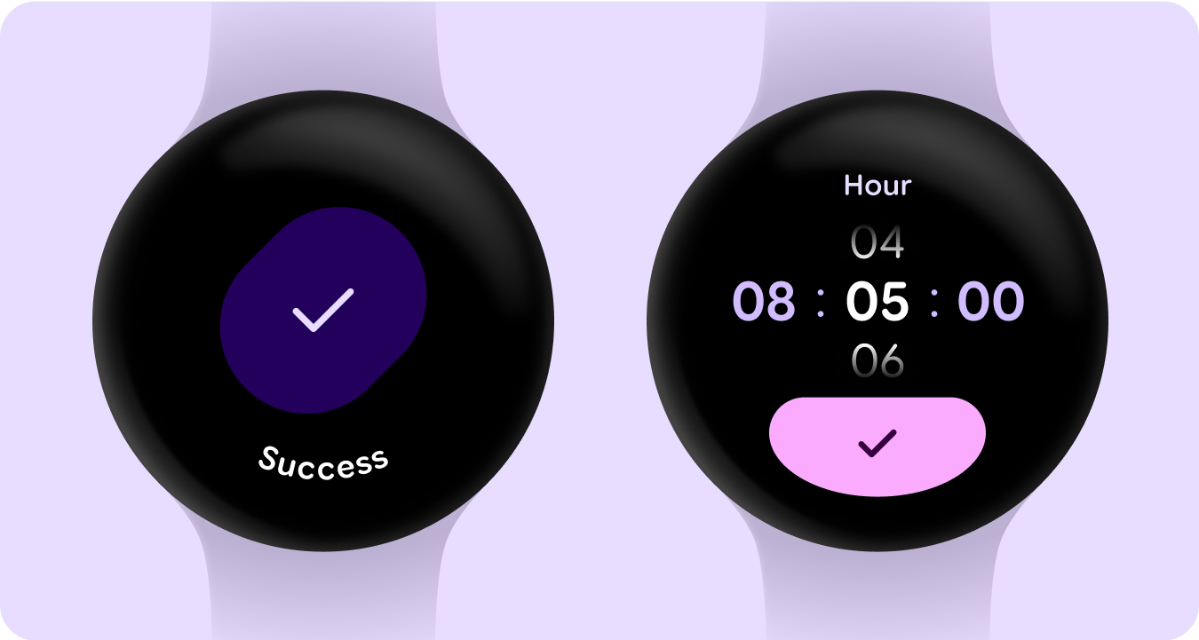 نركّز أيضًا على لغة الأشكال بطريقة أكثر شمولاً وجدوى، وذلك من خلال استخدام أشكال حاويات مرنة لتطبيق التدوير والتوضيح لنصف قطر الزاوية من أجل دعم قوائم تغيير الأشكال وحالات الأزرار. نحن بصدد طرح أزرار محاذية للحواف كنمط تصميم جديد ومميز للأجهزة الدائرية على Wear.