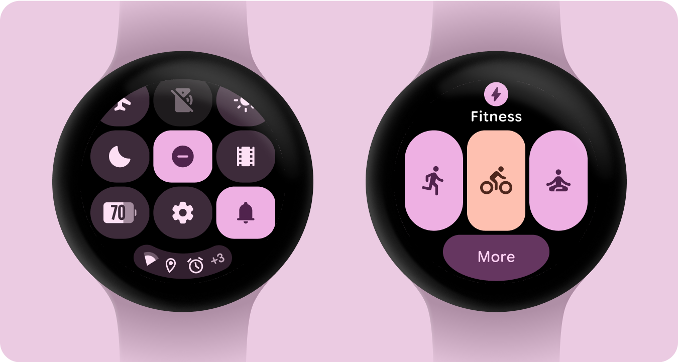 Apps on Wear OS are displayed across multiple surfaces designed around how people interact with the watch, the primary surfaces being complications and tiles.