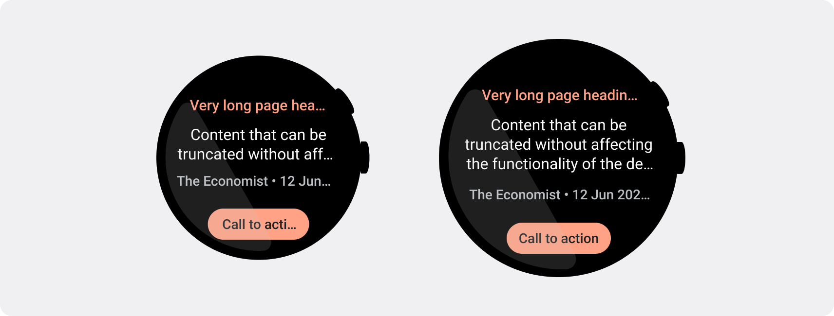 לדוגמה, יכול להיות שללחצן יהיה מקום ליותר תווים במסך גדול יותר לפני שהוא יקוצר, אבל אם מדובר בקריאה חשובה לפעולה שחשובה לחוויית המשתמש, כדאי להשתמש בטקסט קצר מספיק כדי שיופיע במלואו, בלי קיצוץ, במסך של מכשיר קטן.