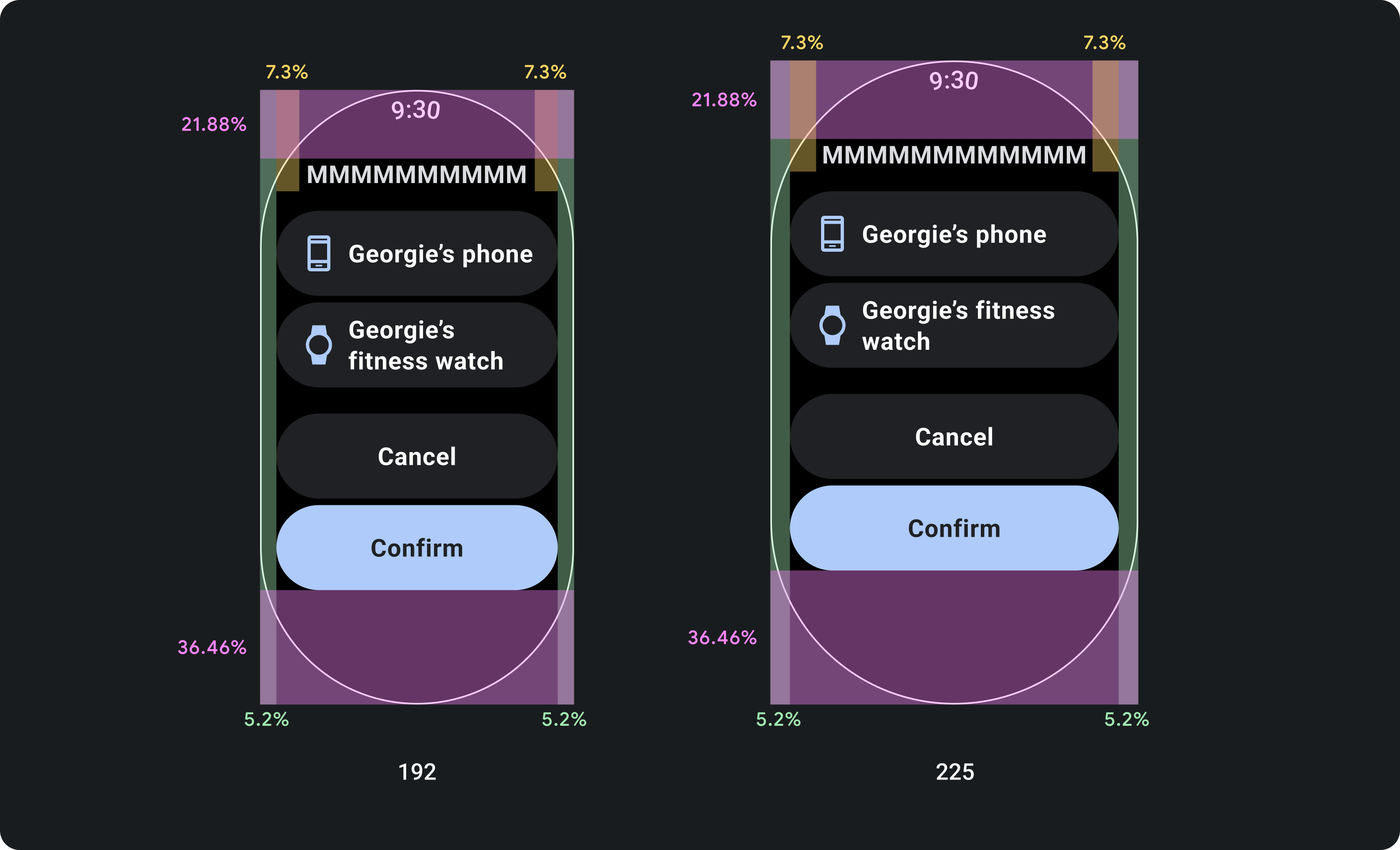 כדי ליצור תוכן שמתאים באופן רספונסיבי לגודל המסך של מכשיר Wear OS, צריך להחיל שוליים באחוזים, כאשר גודל כל שוליים הוא יחסי לגודל המסך. במקרים שבהם פריטים נמצאים בחלק העליון או התחתון של המסך, מומלץ להוסיף עוד רווח פנימי כדי למזער את החיתוך של התוכן מהקצה המעוגל של המסך. לעומת זאת, המרחב בחלק העליון והתחתון גדל כשקבוצת התוכן קטנה מספיק כדי להיכנס למסך אחד.