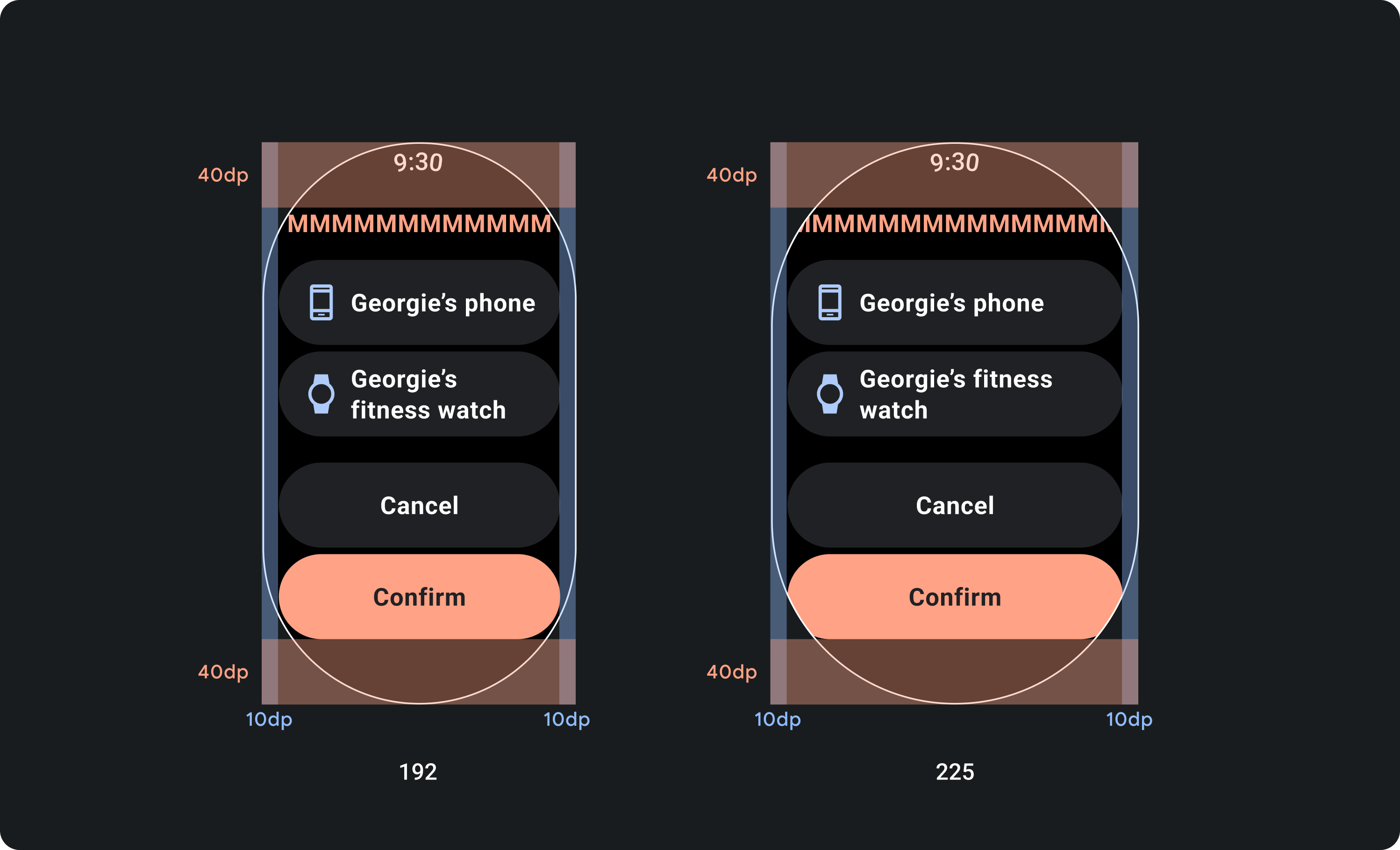 המסכים של שעונים חכמים קטנים יותר מאשר המסכים של מכשירים ניידים, לכן חשוב מאוד לסדר את הרכיבים ולהציג אותם באופן שמאפשר למשתמשים לגשת אליהם ומשתמש ביעילות במרחב המסך הזמין. כדי שהפריטים ייכנסו למסך, כדאי להשתמש במרווחים ובשוליים המתאימים כפי שמפורט בהנחיות לשימוש ב-Material Design.