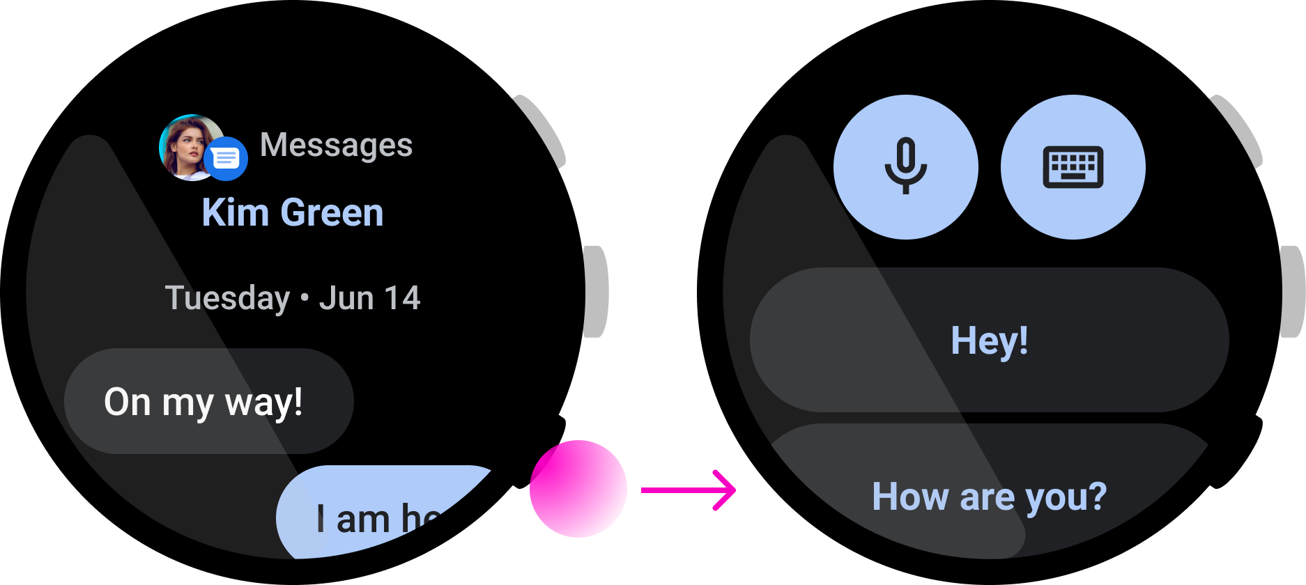 図 4. このメッセージ アプリの返信アクションは複数のステップを必要とするため、ボタンを 1 回押すだけでは完了しません。