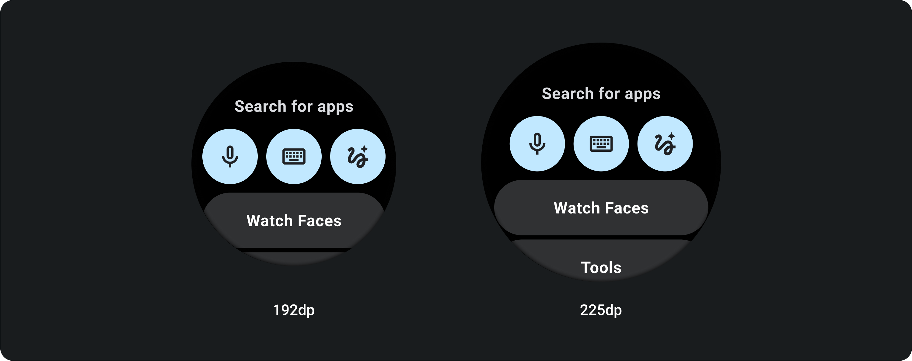 ในหน้าจอที่เล็กกว่า 225 dp ปุ่มจะยังคงเป็นวงกลมและไม่ยืด ในหน้าจอขนาดใหญ่กว่า 225 dp ปุ่มจะขยายไปจนถึงขอบด้านข้าง