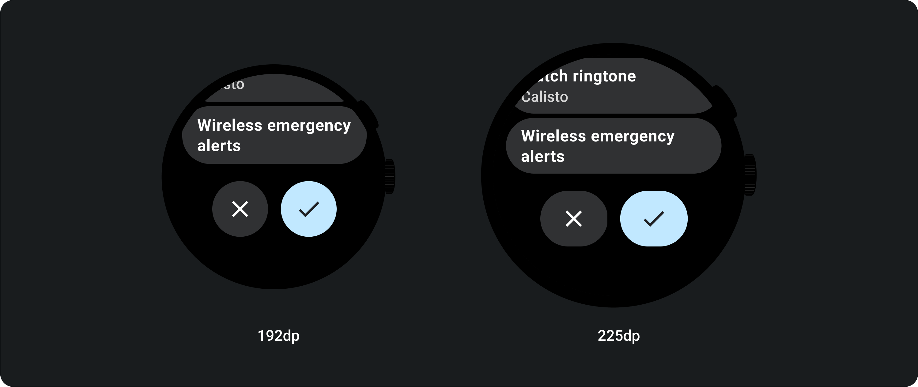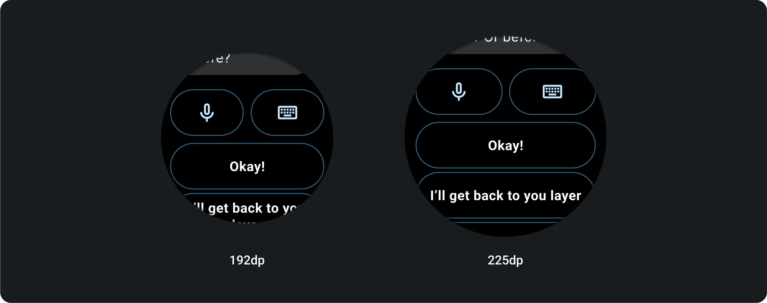 Trên màn hình nhỏ hơn 225 dp, các nút vẫn giữ nguyên hình tròn và không bị kéo giãn. Trên màn hình lớn hơn, từ 225 dp trở lên, các nút sẽ kéo giãn đến tận lề bên.