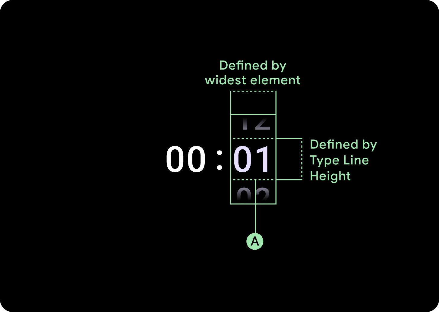 선택 도구 그룹이 사용 가능한 높이와 너비를 채웁니다. 선택 도구 열에는 4가지 레이아웃 옵션이 있습니다. 각 레이아웃은 가운데에 배치되며 사용 가능한 높이를 채웁니다. 열 너비는 글꼴에 필요한 자릿수를 수용하는 데 필요한 너비로 정의됩니다. 날짜 선택 도구는 예외로, 가로로 화면을 채우고 가장자리에서 블러 처리됩니다.