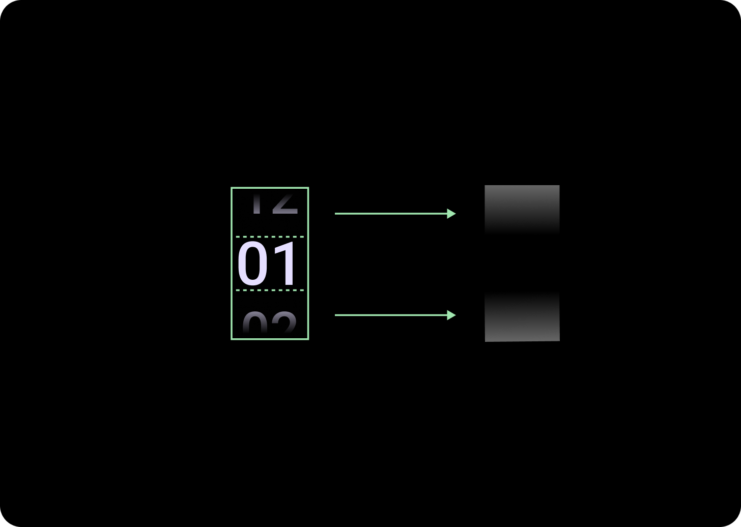 Grupa selektora wypełnia dostępną wysokość i szerokość. Kolumny selektora mają 4 opcje układu. Każdy układ jest wyśrodkowany i wypełnia dostępną wysokość. Szerokość kolumn jest określana przez szerokość potrzebną do umieszczenia liczby cyfr potrzebnych w czcionce. Wyjątkiem jest selektor daty, który wypełnia ekran w poziomie i wychodzi poza jego krawędź.