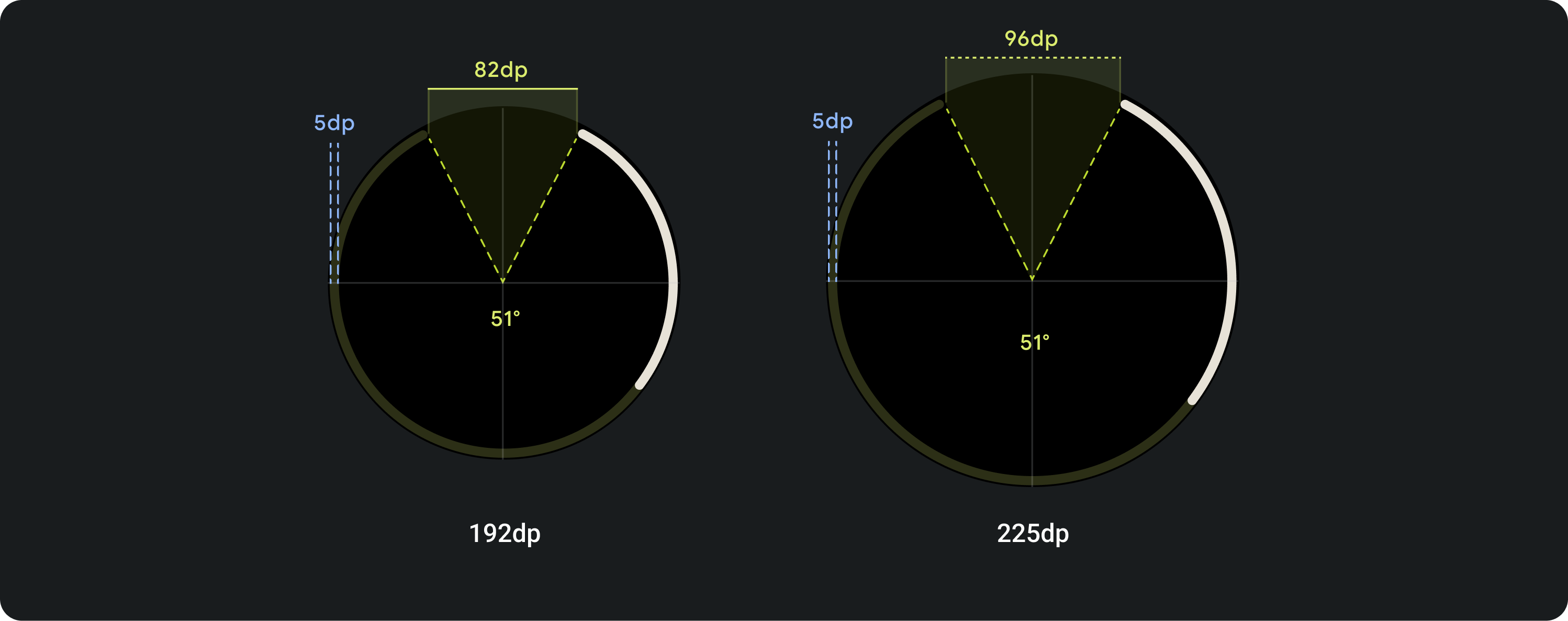 La circonferenza dell'indicatore di avanzamento riempie la larghezza e l'altezza dello schermo/dell'elemento (per il pulsante) in modo proporzionale, mentre lo spessore del tratto rimane lo stesso in tutti i punti di interruzione.