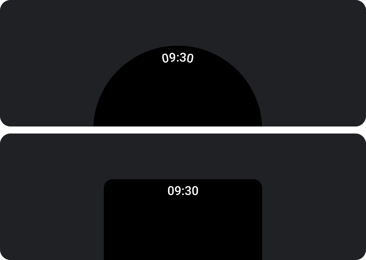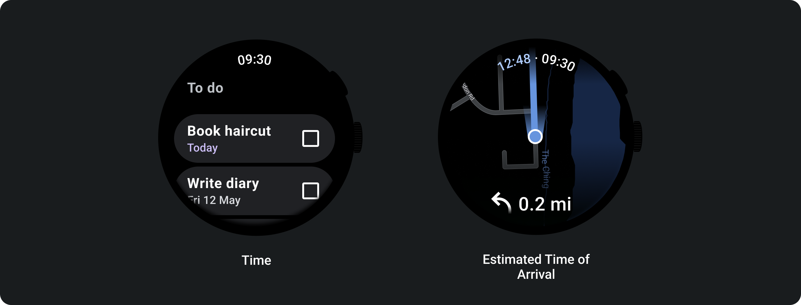 Utilisez le texte temporel pour afficher l'heure, ainsi qu'un libellé facultatif en haut de l'écran. Lorsque l'écran de l'appareil est circulaire, le texte temporel est incurvé. Lorsque l'écran de l'appareil est rectangulaire, le texte temporel est droit.