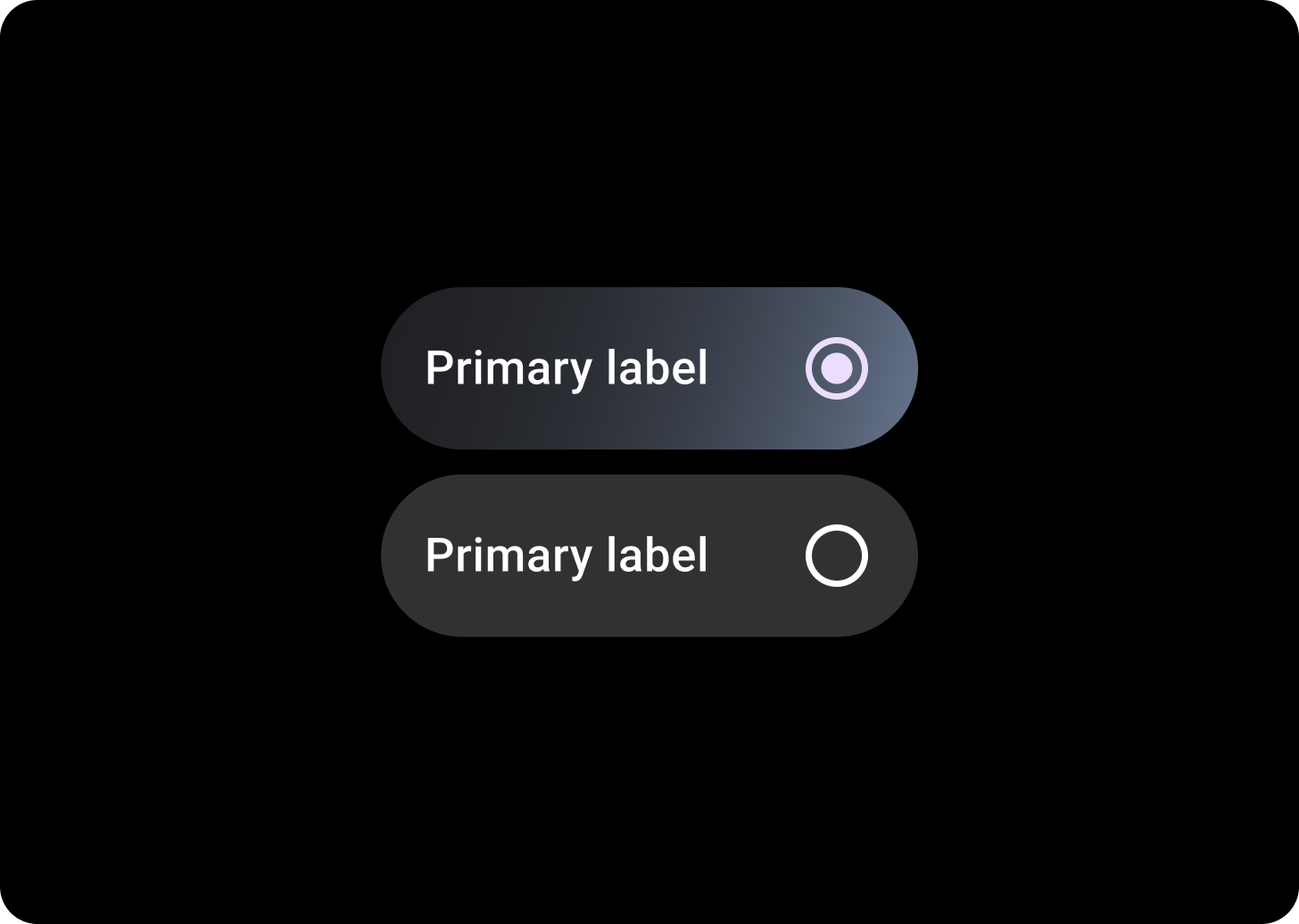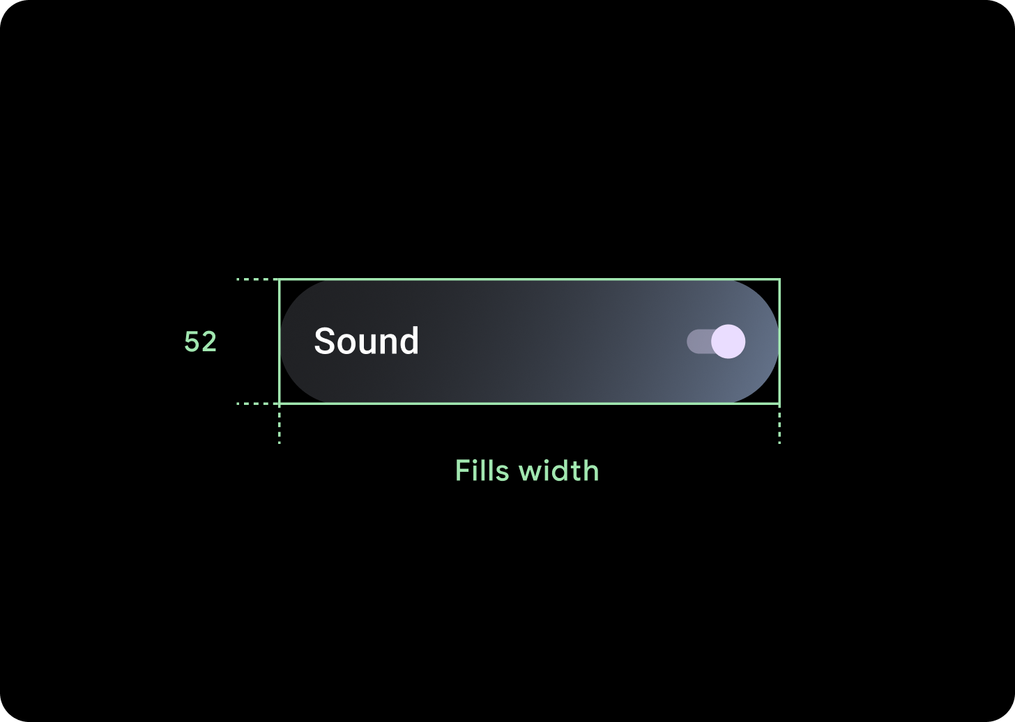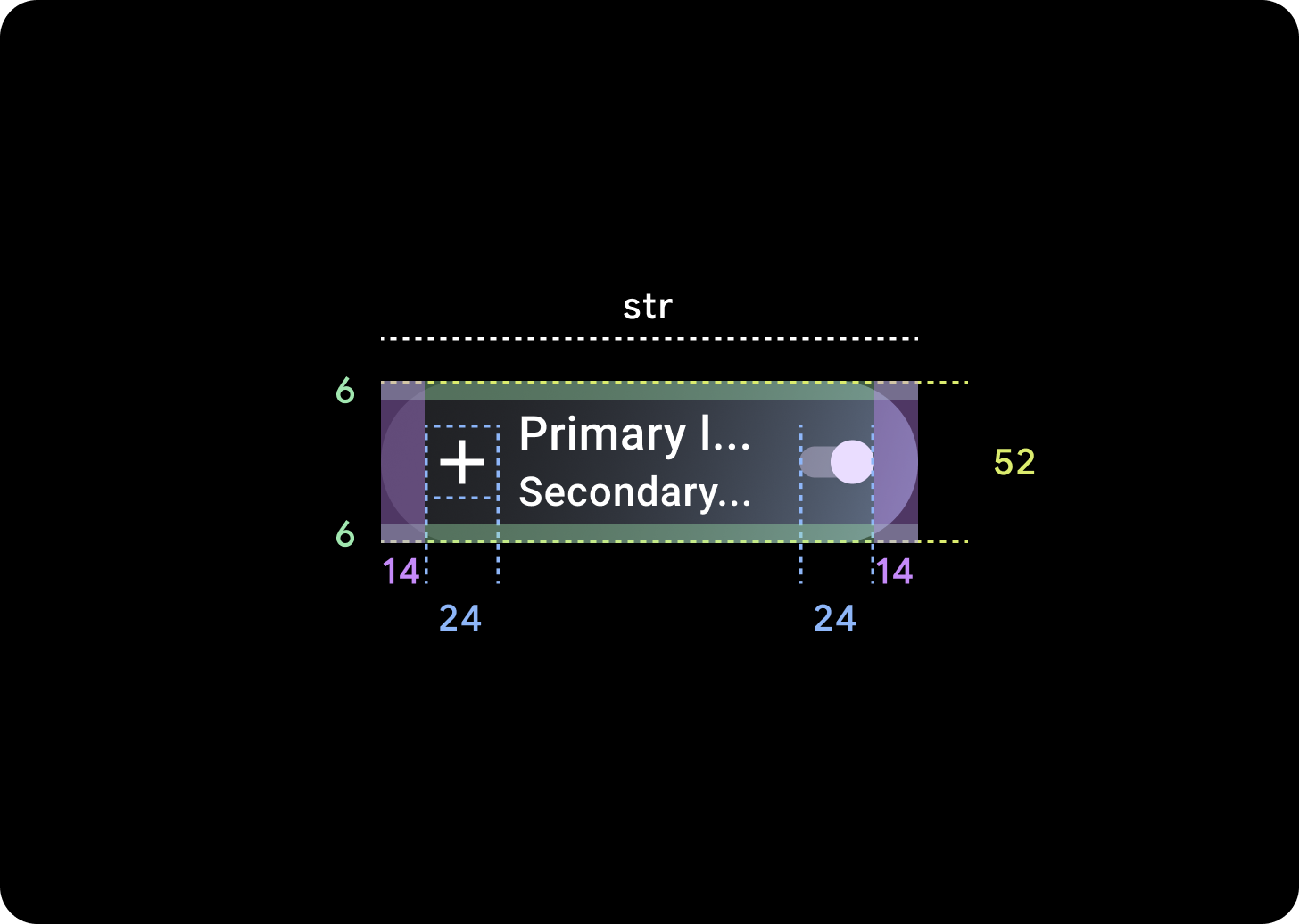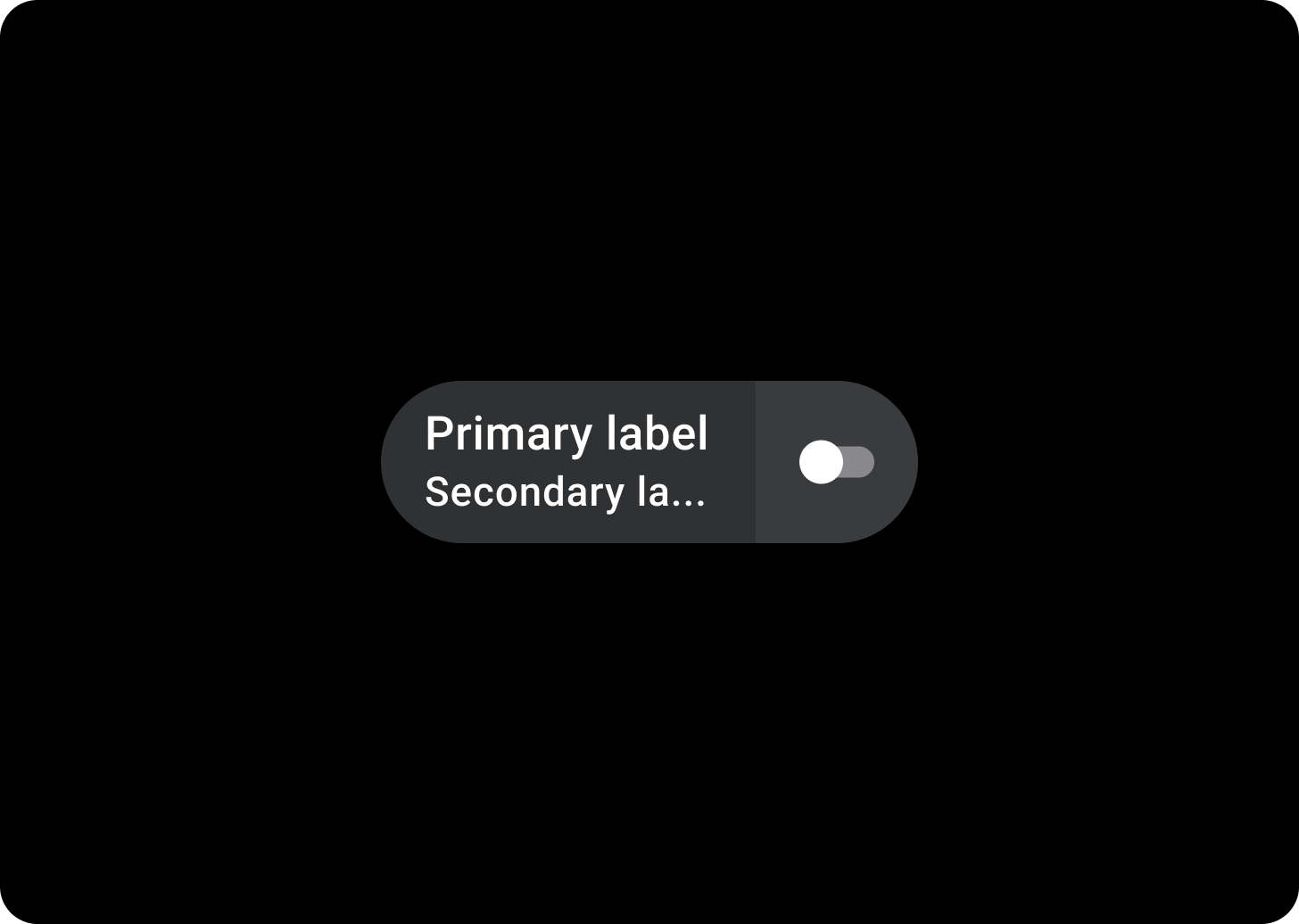 Khối bật/tắt có 4 khe chứa 2 nhãn văn bản, một thành phần điều khiển lựa chọn và một biểu tượng ứng dụng. Biểu tượng và nhãn phụ là không bắt buộc.