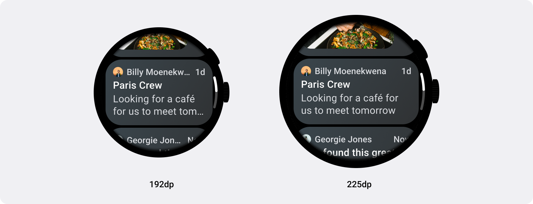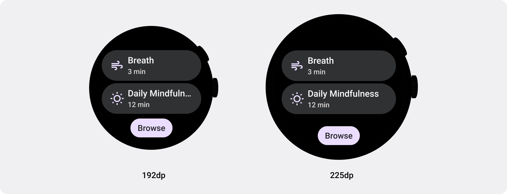 Giao diện người dùng thích ứng kéo dài và thay đổi để tận dụng tối đa tất cả không gian màn hình có sẵn, bất kể kích thước màn hình hiển thị. Khi thiết kế bố cục thích ứng trên màn hình tròn, mỗi khung hiển thị cuộn và không cuộn đều có những yêu cầu riêng để duy trì tỷ lệ phần tử trên giao diện người dùng, cũng như duy trì bố cục và cấu trúc cân bằng. Đối với khung hiển thị cuộn, hãy sử dụng tỷ lệ phần trăm để xác định tất cả lề trên, dưới cùng và bên cạnh để tránh bị cắt và cung cấp tỷ lệ tỷ lệ của các phần tử. Đối với khung hiển thị không cuộn, hãy sử dụng tỷ lệ phần trăm và các điều kiện ràng buộc theo chiều dọc cho tất cả lề. Bằng cách đó, nội dung chính ở giữa có thể kéo giãn để lấp đầy vùng có sẵn.