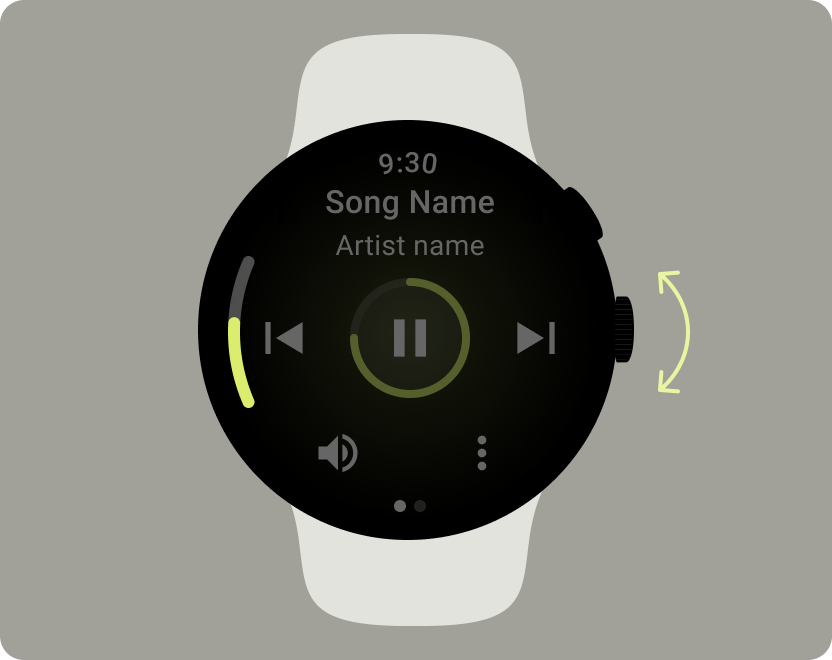 বেশিরভাগ Wear OS ডিভাইসে একটি ঘূর্ণায়মান সাইড বোতাম (RSB) বা একটি বেজেল থাকে। কিছু Wear OS ডিভাইসে ভলিউম নিয়ন্ত্রণ করার জন্য অতিরিক্ত হার্ডওয়্যার বোতামও থাকে। ভলিউম নিয়ন্ত্রণ করতে RSB, বেজেল বা অতিরিক্ত বোতাম ব্যবহার করুন। আরএসবি বা বেজেল ঘোরানো হলেই নির্দেশক দেখান, যেমনটি উদাহরণে দেখানো হয়েছে।