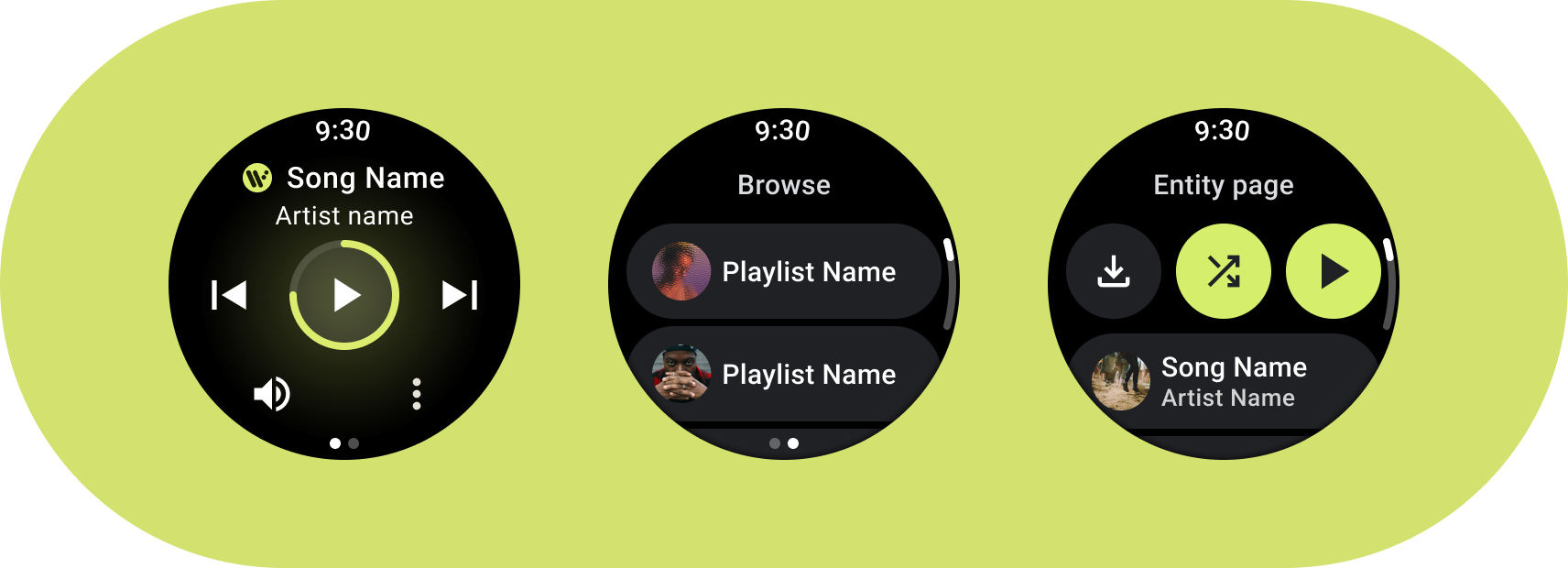 Wear OS এর ডিজাইনের প্রয়োজনীয়তা পূরণ করে এমন মিডিয়া অ্যাপ তৈরি করুন। মিডিয়া অ্যাপ্লিকেশানগুলিতে প্রায়শই ব্রাউজ এবং এন্টিটি পৃষ্ঠা অন্তর্ভুক্ত থাকে।