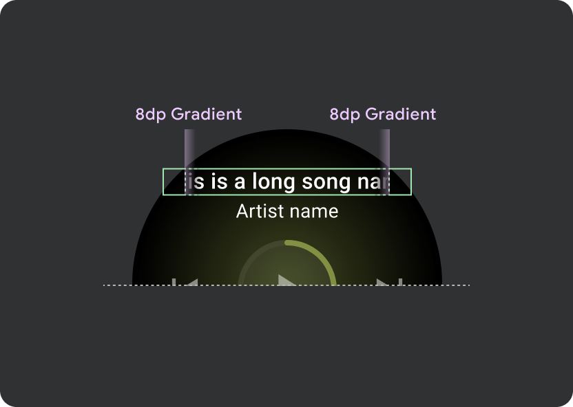 শিরোনামের মধ্যে, 9.38% সার্বজনীন মার্জিন ব্যবহার করুন, একটি অতিরিক্ত গানের শিরোনাম মার্জিন 6.3%। স্ক্রোলিং শিরোনামগুলির জন্য 8dp গ্রেডিয়েন্ট ব্যবহার করুন এবং একটি আইকন উপস্থিত থাকলে একটি অতিরিক্ত 8dp ফাঁক (8dp গ্রেডিয়েন্ট সহ) ব্যবহার করুন৷ আইকনের নীচে যেকোন মার্কি স্ক্রলিং ট্রানজিশন অন্তর্ভুক্ত করুন, যার অবস্থান স্থির থাকে।