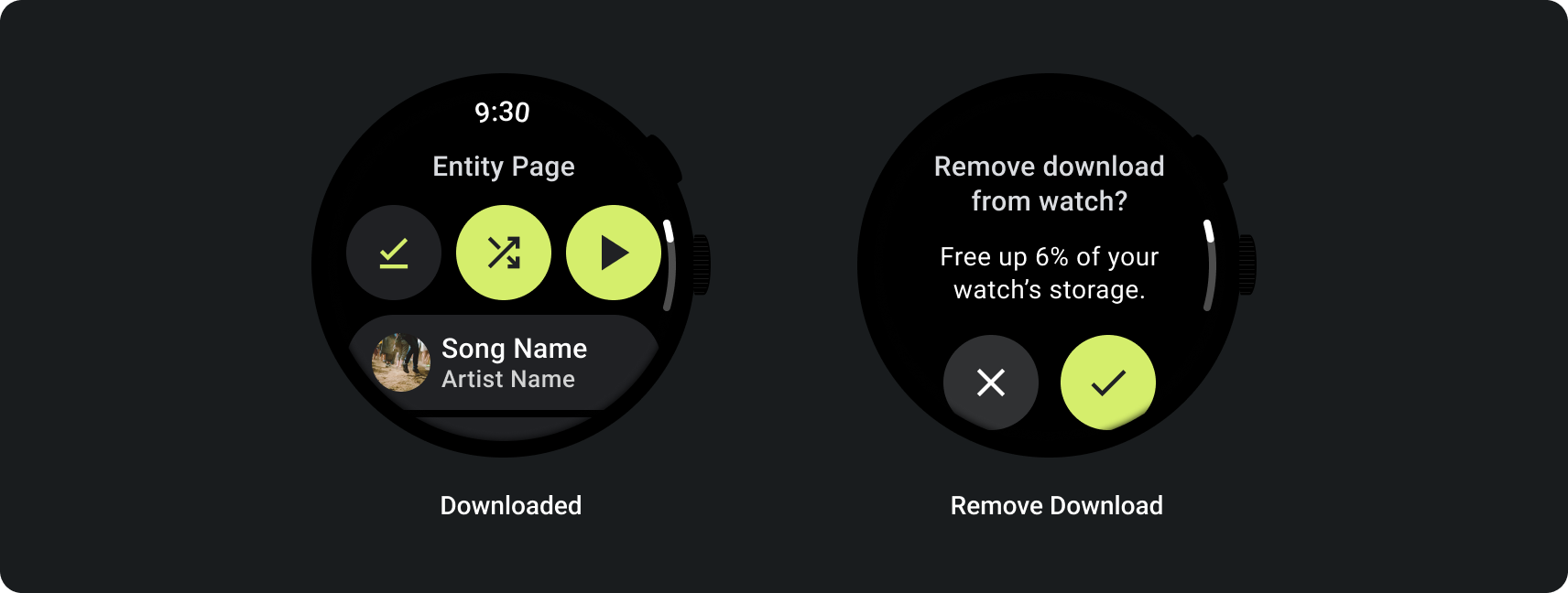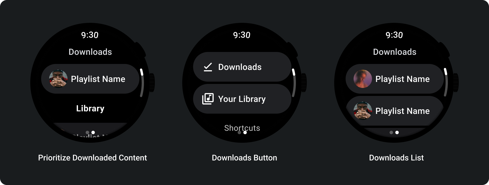 Streaming media dari smartwatch memiliki efek yang signifikan pada baterai perangkat Wear OS. Prioritaskan konten yang didownload saat pengguna memilih untuk mendengarkan di perangkat Wear OS dengan mengekspos download yang baru saja digunakan dalam daftar penjelajahan. Pertimbangkan untuk menambahkan tombol yang membawa mereka ke daftar lengkap download, seperti yang ditunjukkan pada gambar berikut: