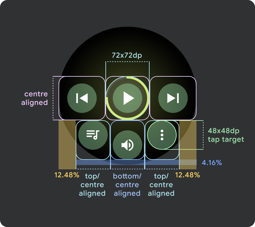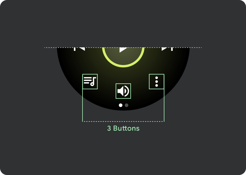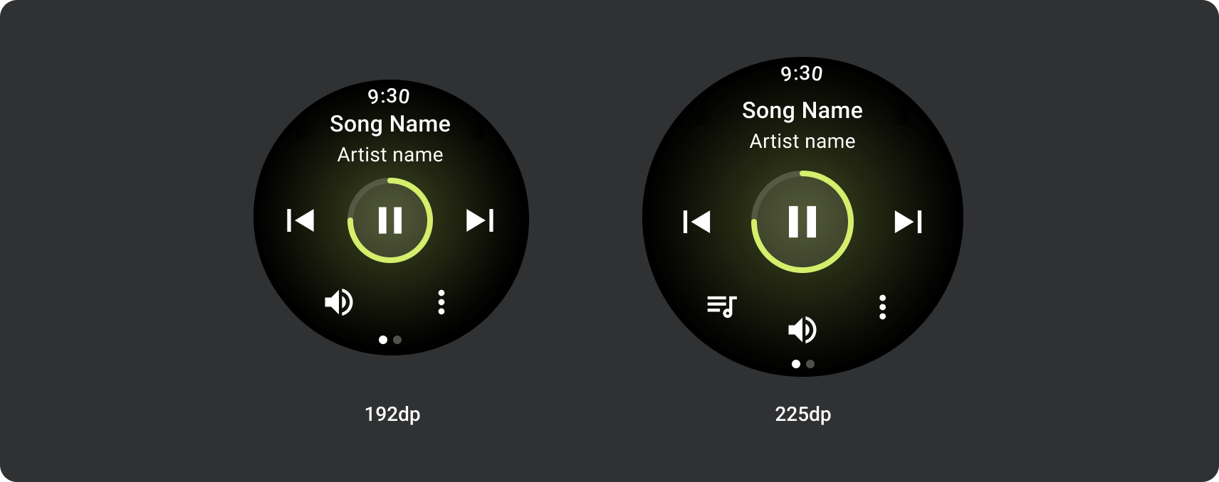 Kontrol utama (Putar/Jeda) diskalakan dari 60 dp menjadi 72 dp di perangkat Wear OS yang lebih besar dari 225 dp, sehingga bagian tengah memiliki tinggi 72 dp, dan dengan demikian meningkatkan target ketuk untuk semua kontrol di dalamnya. Ini adalah perilaku responsif bawaan yang akan Anda warisi dari template Pemutar Media.
