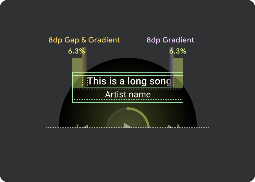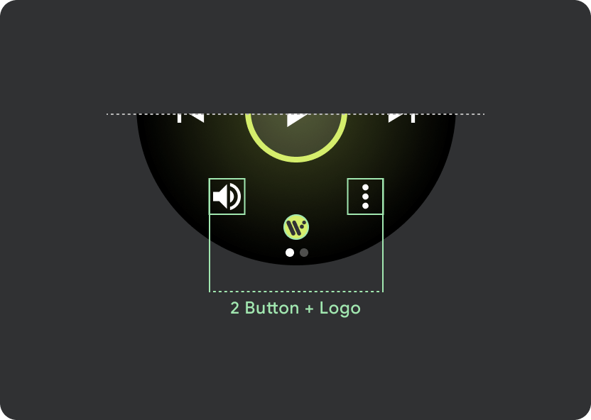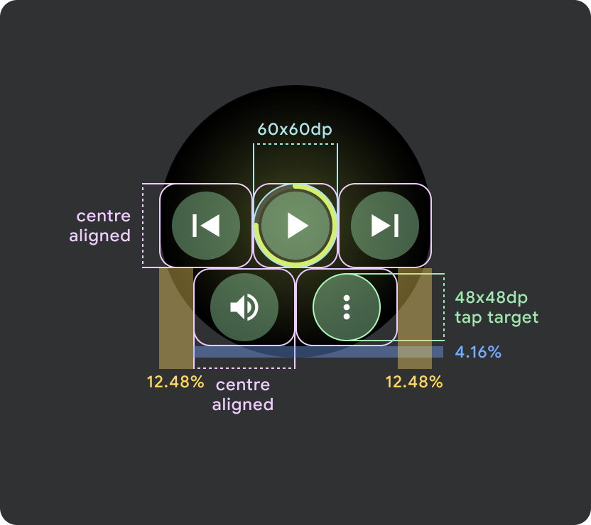 Główny element sterujący (odtwarzanie/pauza) zmienia rozmiar z 60 dp na 72 dp na urządzeniach z Wear OS większych niż 225 dp, co powoduje, że środkowa sekcja ma wysokość 72 dp, a tym samym zwiększa obszar dotykowy wszystkich elementów sterujących. Jest to wbudowane zachowanie responsywne, które dziedziczysz z szablonu odtwarzacza multimediów.