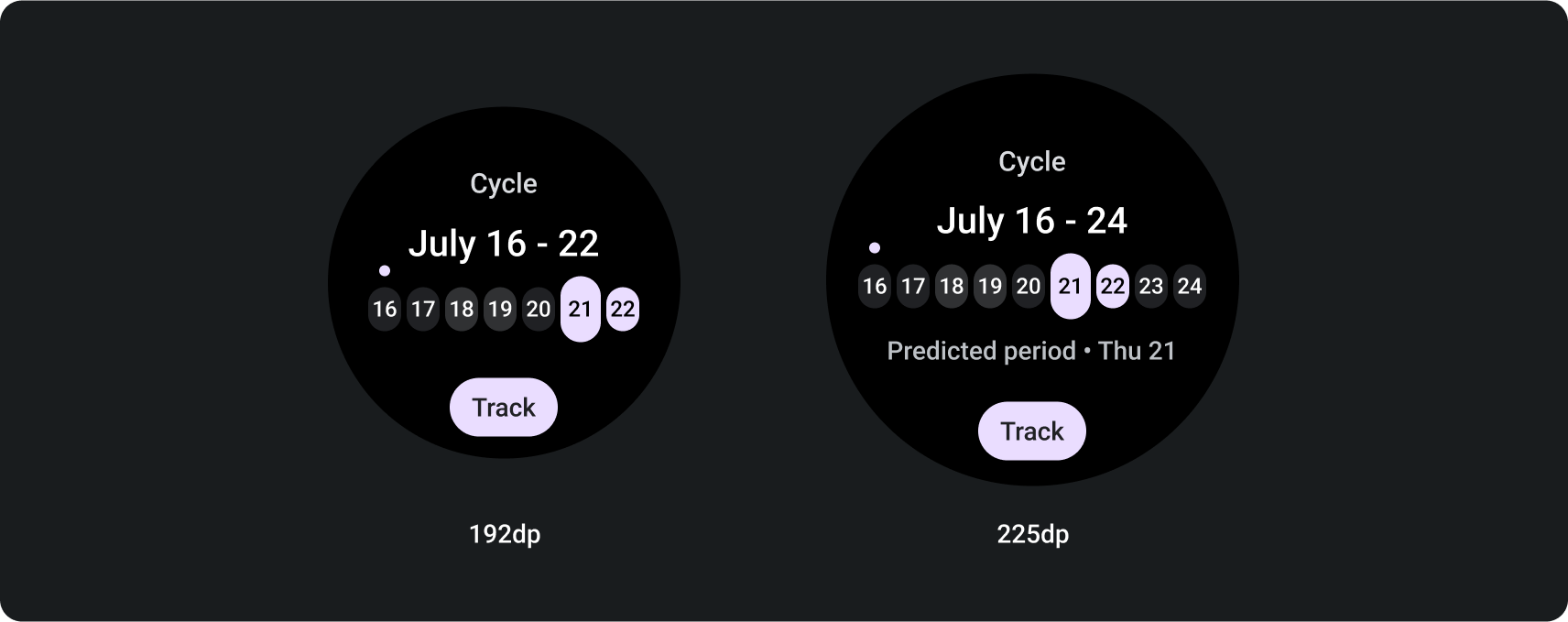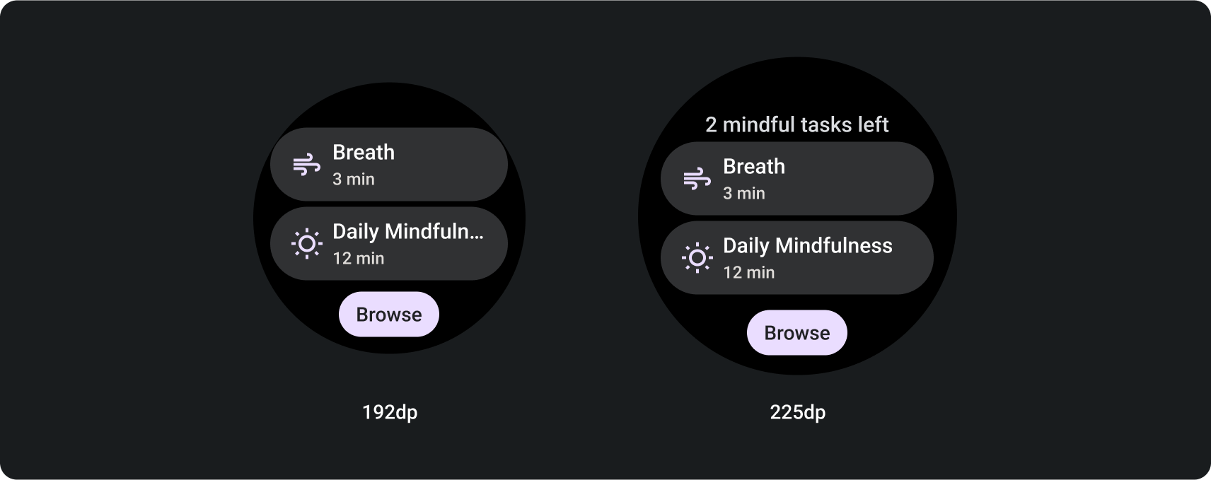 Les modèles suivants montrent comment les mises en page de cartes s'adaptent de manière réactive aux appareils Wear OS dotés d'un écran de plus grande taille. Ces exemples illustrent le comportement intégré, qui permet d'optimiser l'espace supplémentaire à l'écran sans frais par une taille d'écran plus grande. En tant que développeur d'applications, vous pouvez également définir plusieurs mises en page possibles, ainsi qu'un point d'arrêt qui indique au système quelle mise en page afficher (un "plus petit écran" ou un "écran plus grand").