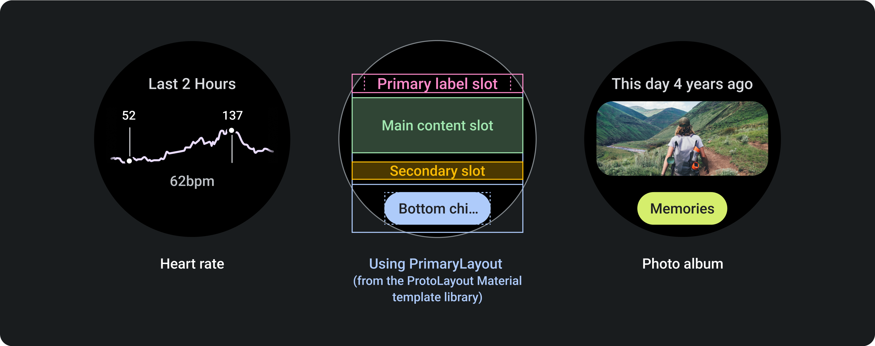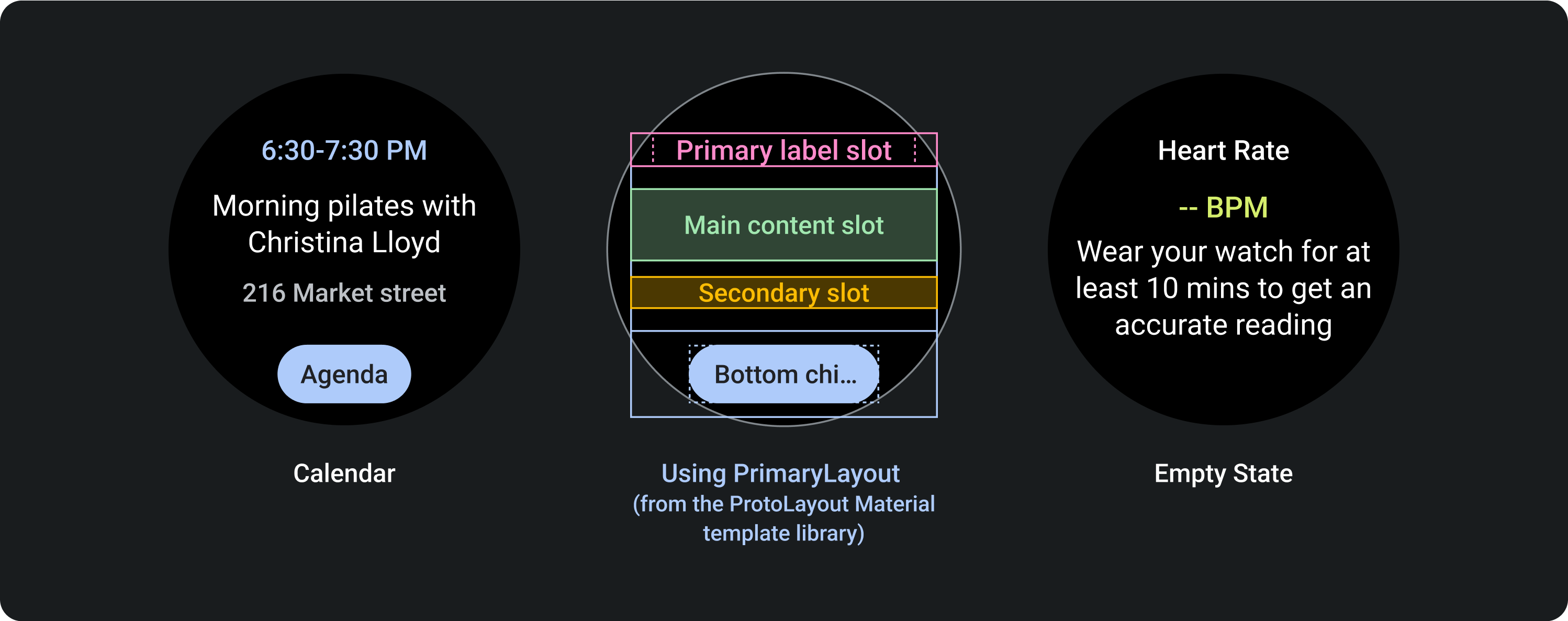 Эти шаблоны макетов ProtoLayout Material с фиксированной высотой обеспечивают основу и леса, на которых строятся все плитки. Единственные различия между ними — это встроенные поля и внутренние отступы. Чтобы обеспечить единообразие дизайна плиток других приложений, используйте рекомендуемые слоты, показанные на предыдущем изображении.