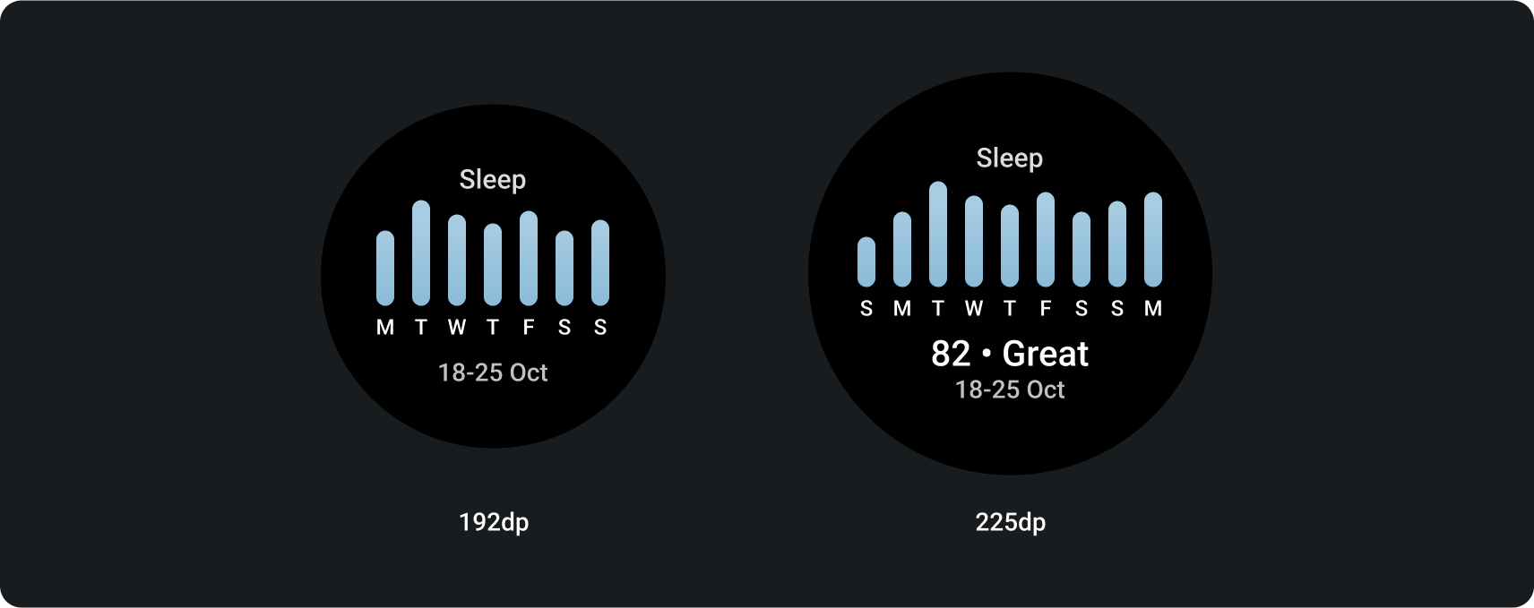 Следующие шаблоны показывают, как макеты плиток адаптируются к устройствам Wear OS с экранами большего размера. Эти примеры иллюстрируют встроенное поведение, которое помогает максимизировать дополнительную площадь экрана, обеспечиваемую большим размером дисплея. Как разработчик приложения вы также можете определить несколько возможных макетов вместе с точкой останова, которая сообщает системе, какой макет отображать («экран меньшего размера» или «экран большего размера»).