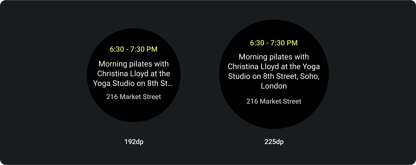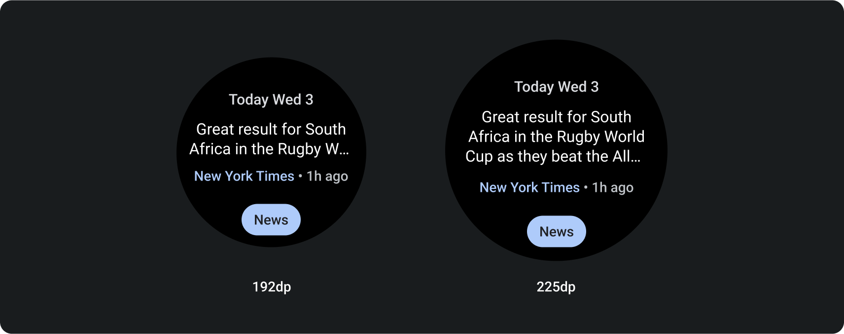 以下範本顯示資訊方塊版面配置如何因應螢幕尺寸較大的 Wear OS 裝置進行調整。這些範例說明內建行為,對於較大的顯示大小所提供的額外螢幕實際狀態最大化。應用程式開發人員也可以定義多個可能的版面配置,以及中斷點,告知系統要顯示的版面配置 (「小螢幕」或「大螢幕」)。