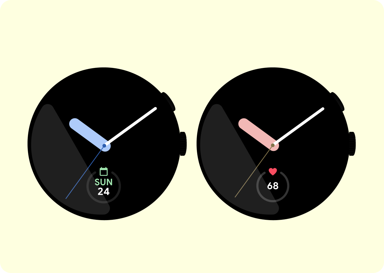 O mostrador do relógio é a primeira camada com que os usuários interagem no smartwatch, bem como a camada mais usada do Wear OS. É possível personalizar o mostrador de acordo com o estilo ou as necessidades de cada usuário.