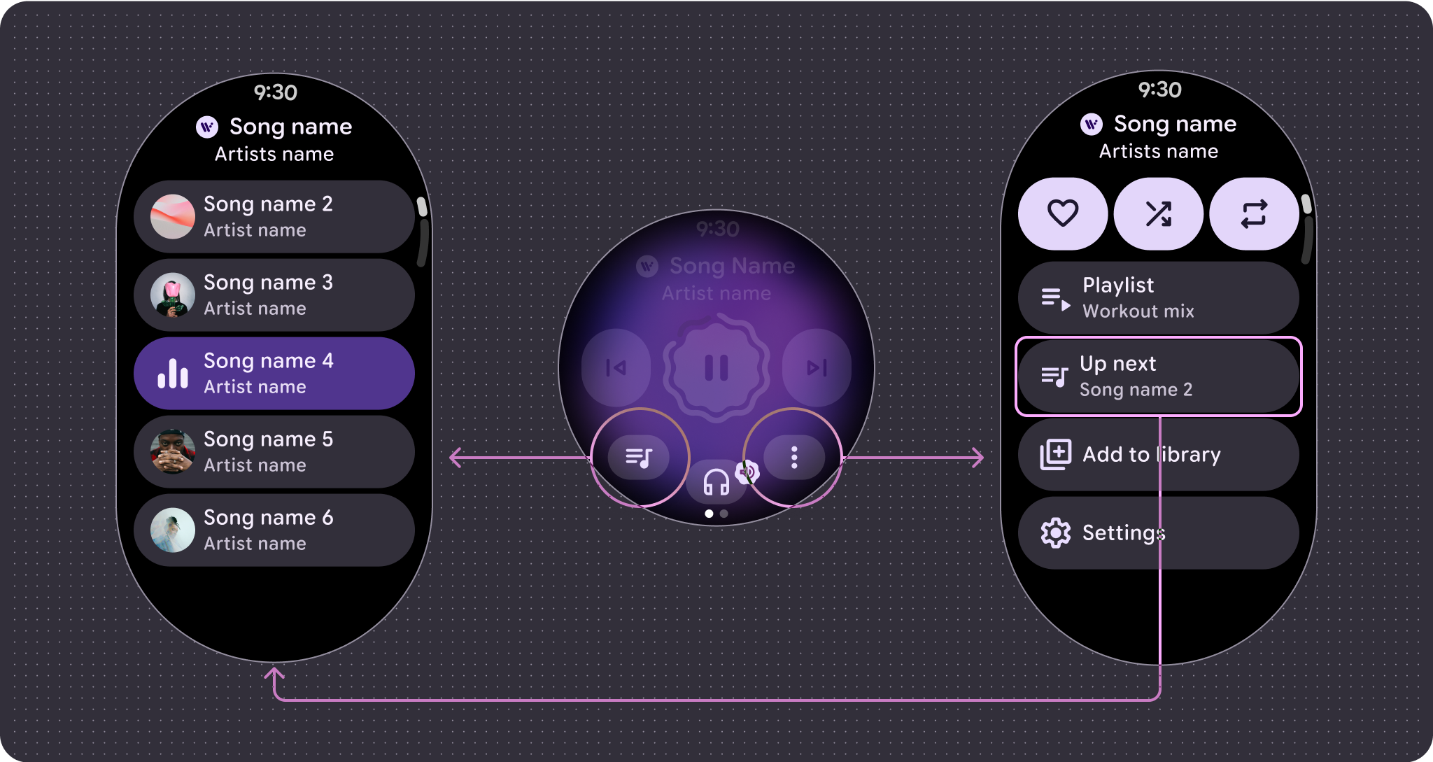 A tela de controles de mídia é essencial para ajudar os usuários a controlar o que estão ouvindo. Crie controles de mídia usando um layout de cinco botões para verificar se os requisitos de área mínima de toque foram atendidos. Em telas maiores, com 225 dp ou mais, você pode adicionar valor incluindo um botão de atalho para uma ação importante, como fila de reprodução.