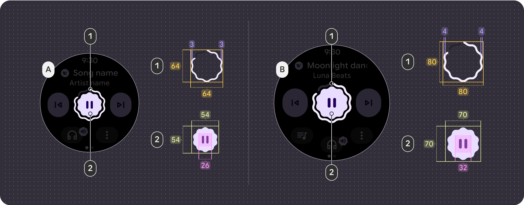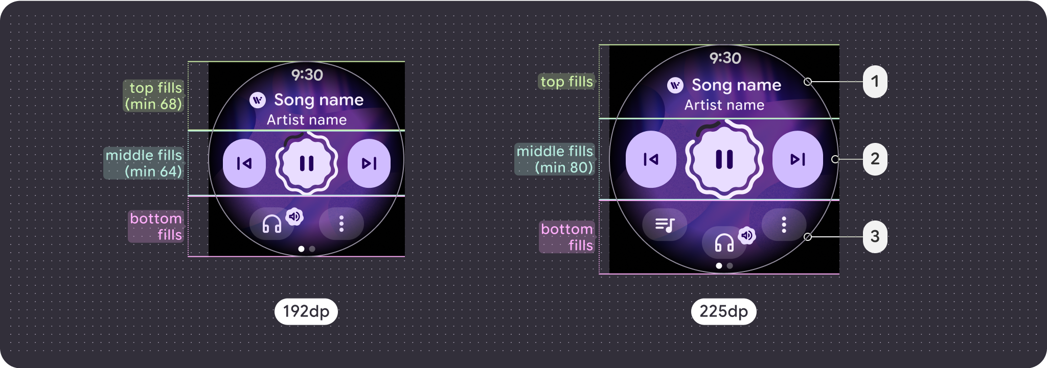 O controle principal geralmente é um botão de reproduzir e pausar. Depois do ponto de interrupção de 225 dp, o controle é dimensionado de 64 dp para 80 dp, o que aumenta os destinos de toque para todos os controles dentro dele.