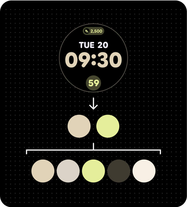 Wear OS implementiert ein Designsystem, das den Richtlinien für barrierefreie Webinhalte (Web Content Accessibility Guidelines, WCAG)-AAA entspricht und aus zwei ausgewählten Grundfarben abgeleitet ist. Insbesondere dienen diese Grundfarben als Grundlage für primäre und sekundäre Paletten. Anhand dieser beiden Anfangsfarben generiert das System eine umfassende Farbpalette, die primäre, sekundäre, tertiäre und Oberflächenpaletten umfasst. Anschließend wird dieses generierte Design auf Wear OS-Komponenten, System-UI-Elemente, Kacheln und Apps angewendet.