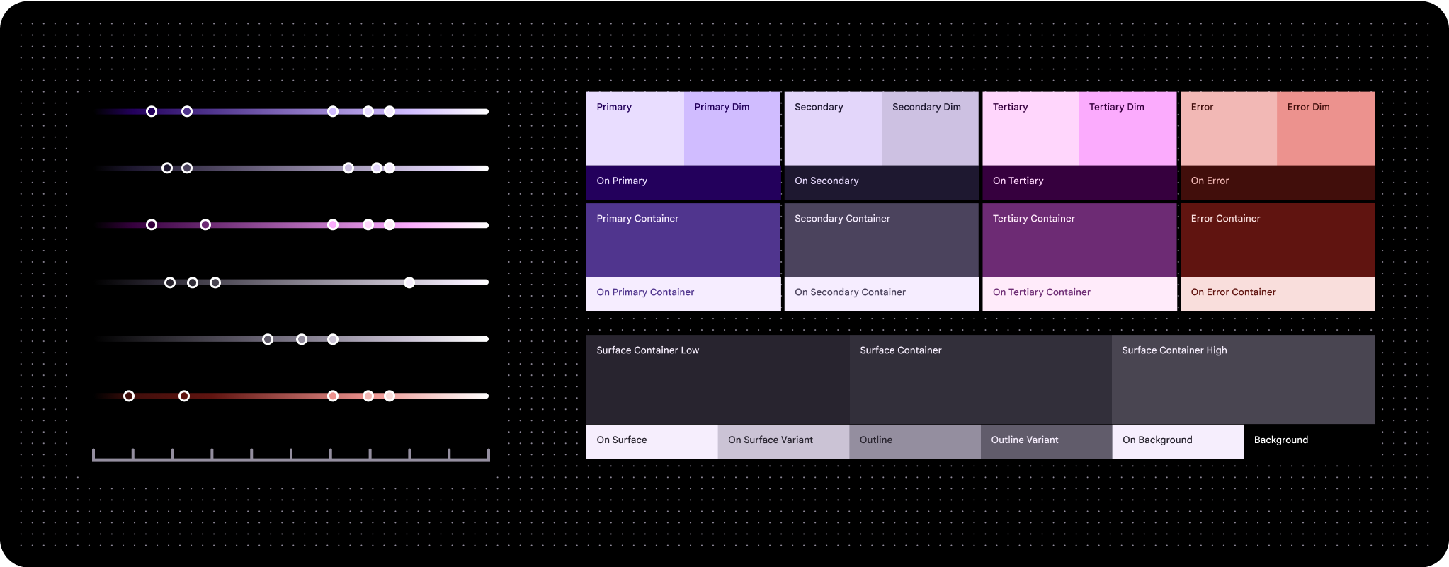 - Comme les "chiffres" sur un canevas de peinture par numéros, les rôles de couleur sont attribués à des éléments d'interface utilisateur spécifiques. Ils portent des noms tels que "primary", "on primary" et "primary container". Le même rôle de couleur est utilisé pour les thèmes clair et sombre. Afficher tous les rôles de couleur