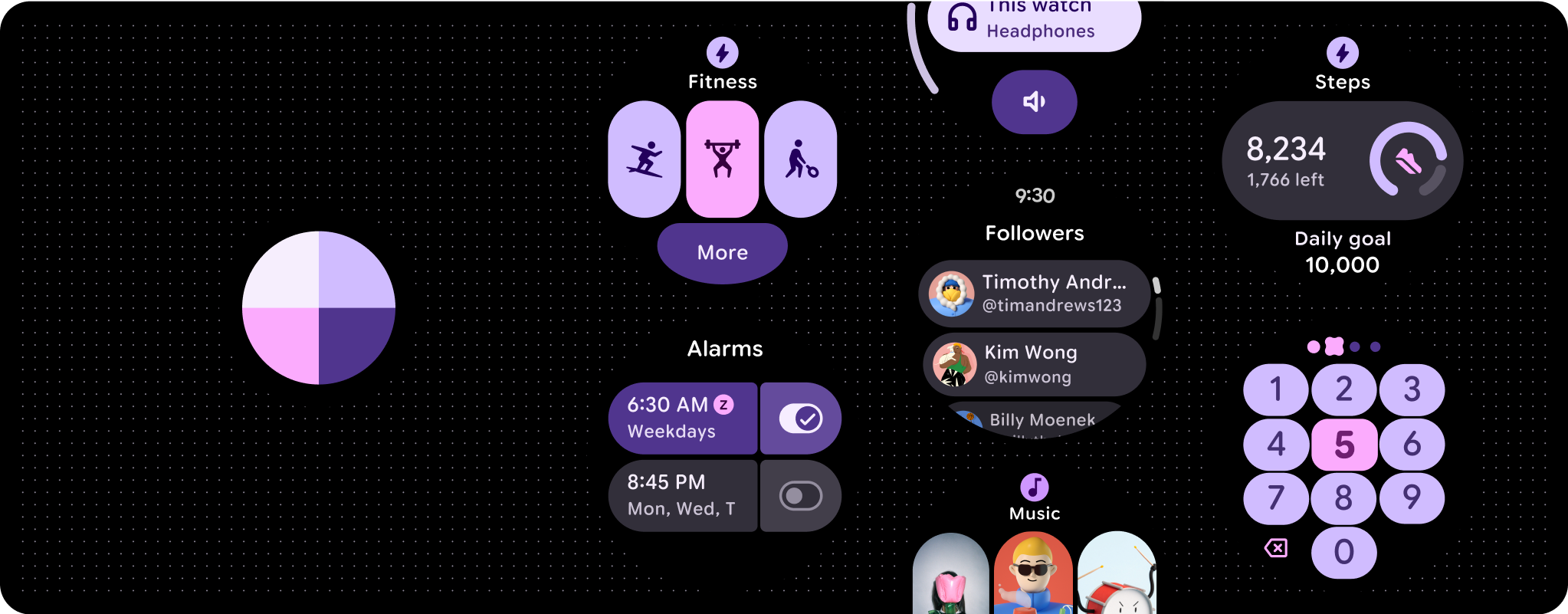 בדומה לאופן שבו נעשה שימוש בתפקידי צבעים ב-Material 3 Expressive, ב-Wear OS נעשה שימוש בצבע כדי להתאים אישית חוויות באמצעות ביטוי דינמי ונגיש של צבעים. ב-Wear OS נעשה שימוש רק בעיצוב כהה, כי הממשק של השעון החכם מבוסס על רקע שחור. Wear OS היא פלטפורמה שפועלת במכשירי מגע, ולכן גם לצבעים שלה יש מגוון מוגבל יותר, כי היא לא דורשת כל כך הרבה מצבי מעבר מעל או התמקדות. אתם יכולים להשתמש בכלים הספציפיים ל-Wear OS ליצירת עיצוב בצבעים שמותאם למותג שלכם, וליצור לוחות צבעים מלאים ותפקידי צבעים שהוקצתה להם תמיכה באסימונים של Material Design, ועומדים בדרישות לעבודה חלקה עם רכיבי ממשק המשתמש של המערכת.