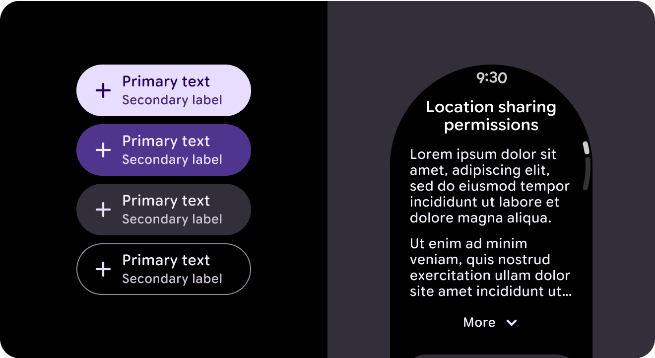 Setiap blok teks dalam tata letak menggunakan framework ukuran font yang dapat dikonfigurasi pengguna Wear OS, dengan setiap gaya dan peran jenis meningkatkan / menurunkan skala dengan penambahan +/- 6% berdasarkan apa yang ditetapkan oleh pengguna dalam setelan sistem.