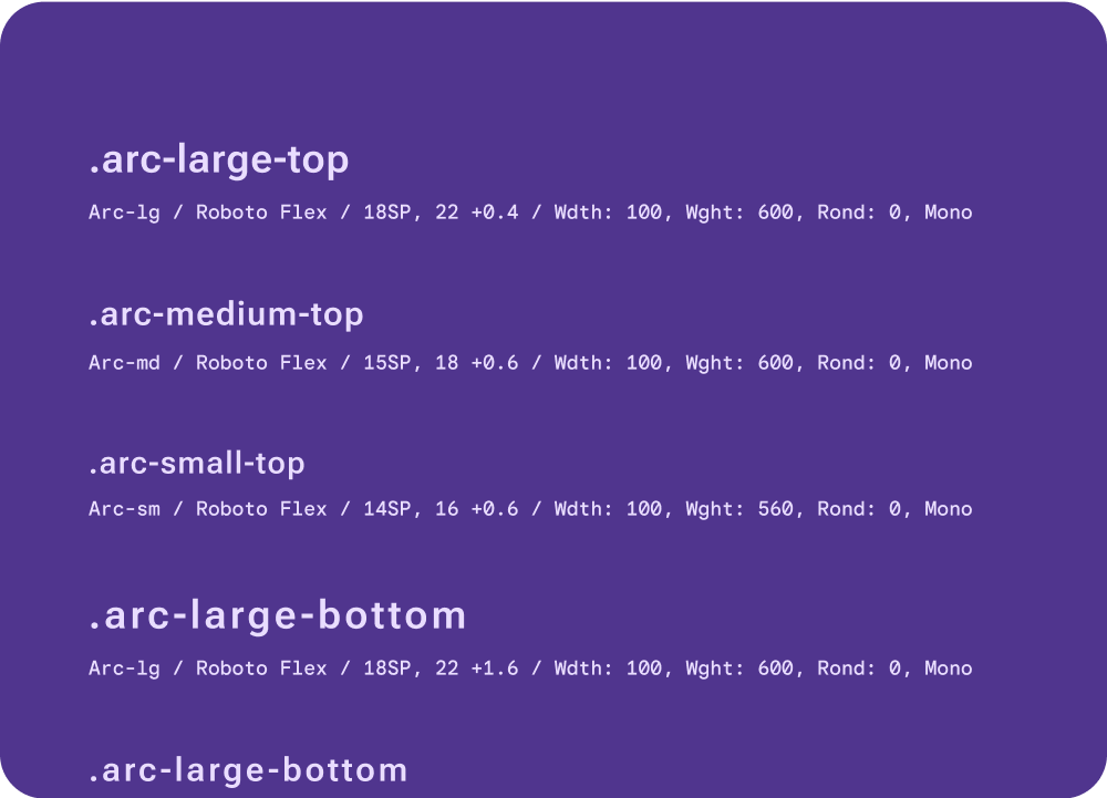 Scaling: All Arc type styles scale with user-configurable font size preferences. Scaling on fonts 20sp and up isn't allowed because of the limited screen space on Wear OS devices.