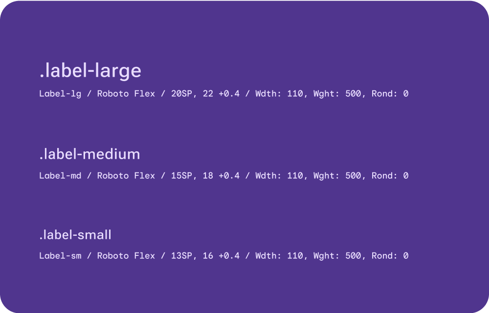 The Material 3 Expressive type scale features a combination of 21 styles, each with an intended application and meaning. They're assigned based on use (such as display or label), and grouped more broadly into categories based on scale (such as large or small). The default type scale for Material 3 Expressive is Roboto Flex, which creates a cohesive typography experience.