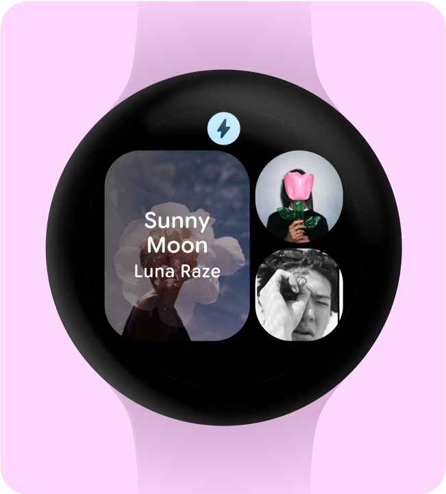 Quando a opção estiver ativada (por exemplo, usando o ProtoLayout Material3 PrimaryLayout), o Wear OS vai mostrar automaticamente o ícone permanente do app, que será exibido automaticamente conforme o usuário rola pelo carrossel de Blocos. O ícone do app não deve ser projetado e adicionado como parte do Bloco.