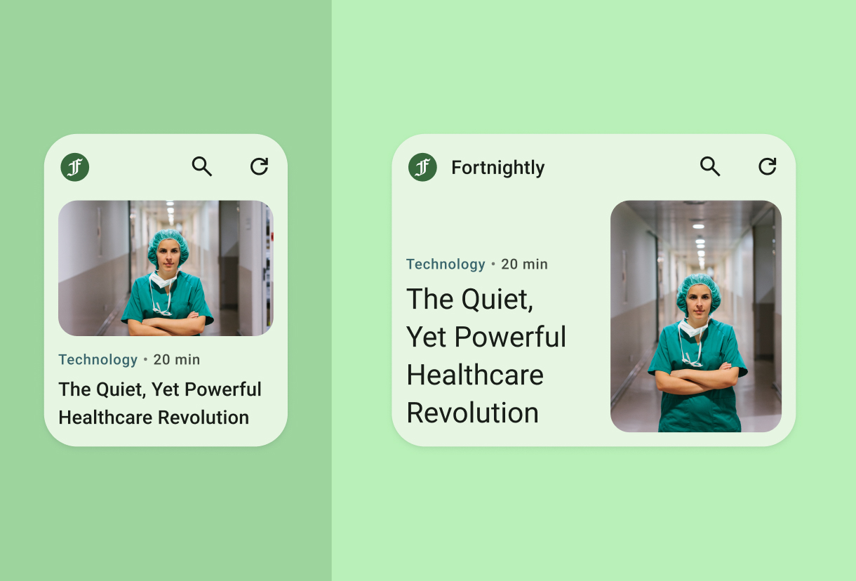 เพิ่มวิดเจ็ตเพื่อยกระดับประสบการณ์ของผู้ใช้ วิดเจ็ตเป็นองค์ประกอบหน้าจอหลักที่ปรับแต่งได้ ซึ่งแสดงมุมมองที่ชัดเจนและนำไปใช้ได้จริงสำหรับเนื้อหาหรือการดำเนินการของแอป