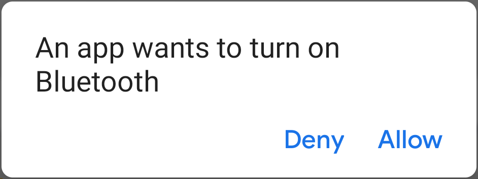 Sebuah dialog muncul meminta izin pengguna untuk mengaktifkan Bluetooth, seperti yang ditunjukkan di gambar 1. Jika pengguna memberikan izin, sistem akan mulai mengaktifkan Bluetooth, dan fokus akan kembali ke aplikasi Anda setelah proses selesai (atau gagal).
