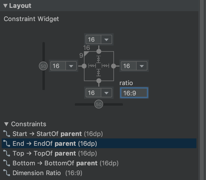 Puedes establecer el tamaño de la vista en una proporción, como 16:9, si al menos una de las dimensiones de la vista está configurada en "Match Constraints" (0dp