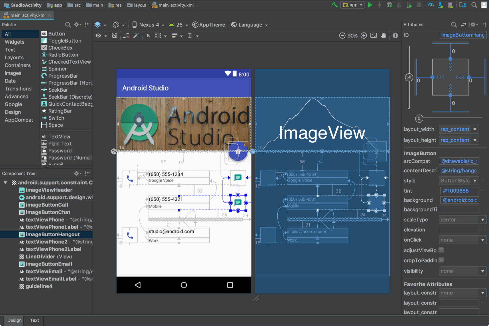 Rysunek 3. Edytor układu w Android Studio pokazujący ConstraintLayout.
