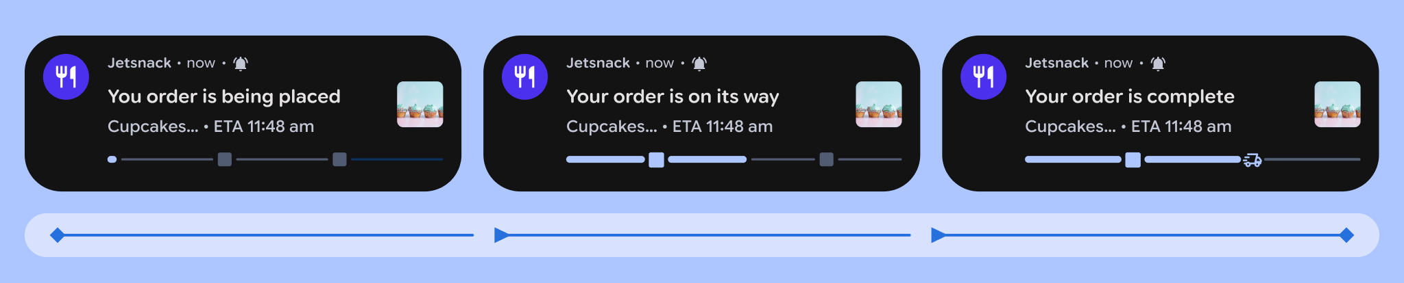 צ'יפים של סטטוס מאפשרים למשתמשים לעקוב אחרי עדכונים בזמן אמת כשההתראה לא מוצגת. אפשר להשתמש ב-setShortCriticalText או ב-setWhen כדי להעביר מידע חשוב על מצב ההתקדמות בהתראה.