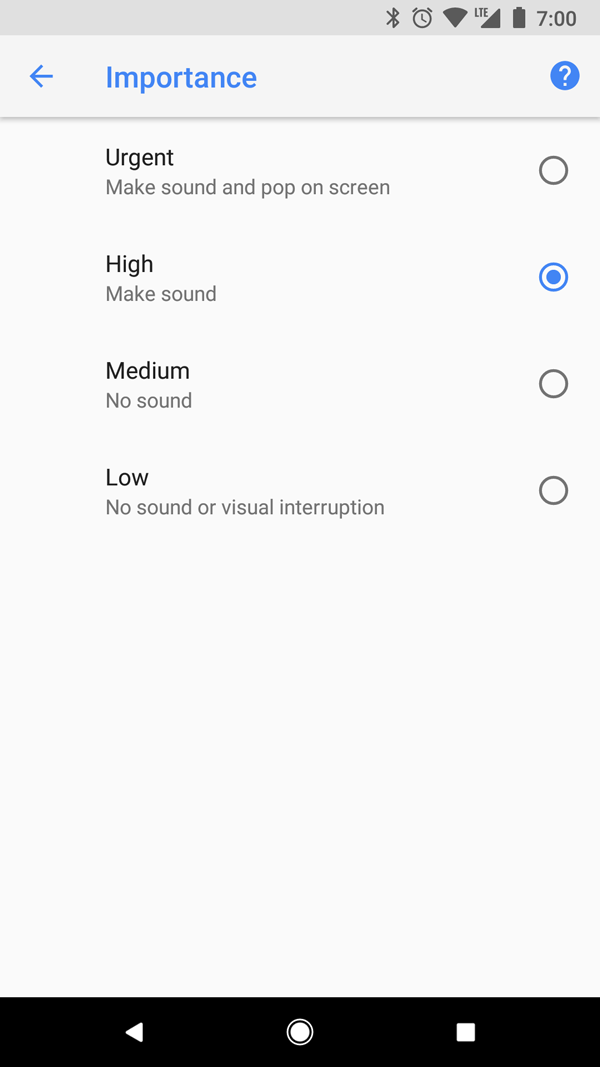اندروید از اهمیت نوتیفیکیشن استفاده می کند تا مشخص کند که اعلان تا چه حد به صورت دیداری و شنیداری کاربر را قطع می کند. هرچه اهمیت یک اعلان بیشتر باشد، اعلان مزاحم تر است.