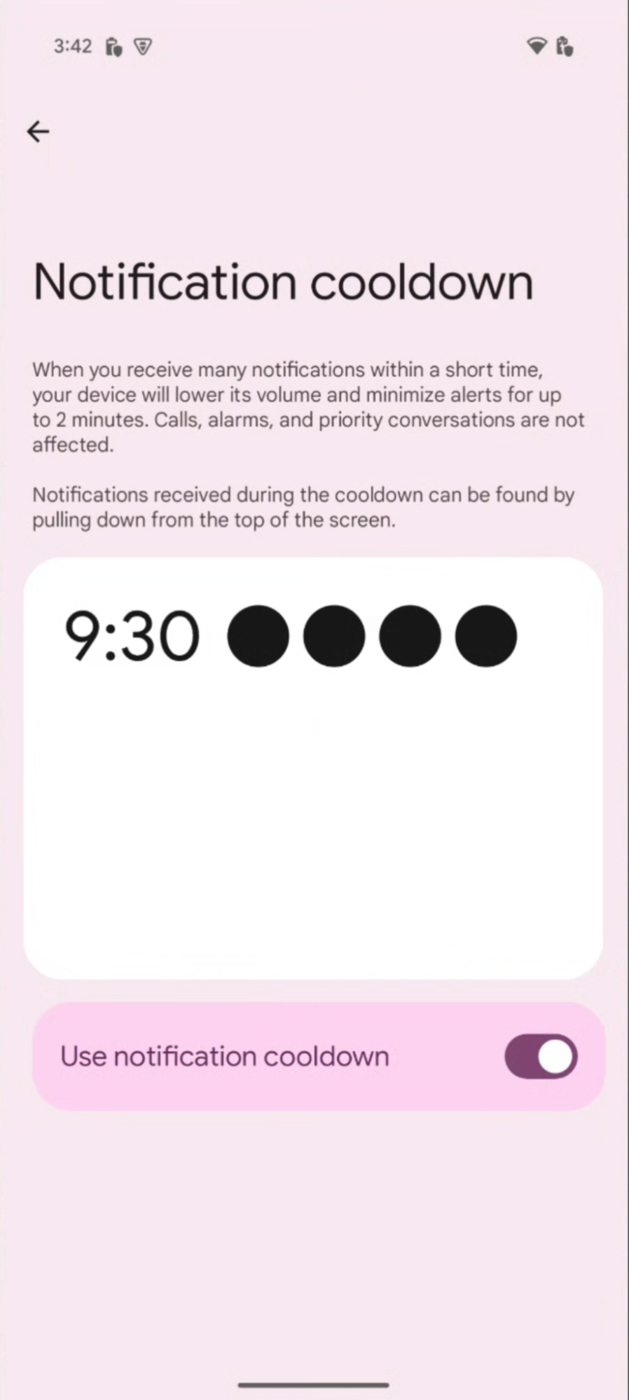 اندروید 15 یک ویژگی خنکسازی اعلانها را معرفی میکند که هدف آن بهبود تجربه اعلانهایی است که بهسرعت دریافت میشوند. این ویژگی ظاهر، حجم صدا و شدت لرزش اعلان های تکراری را تا دو دقیقه کاهش می دهد.