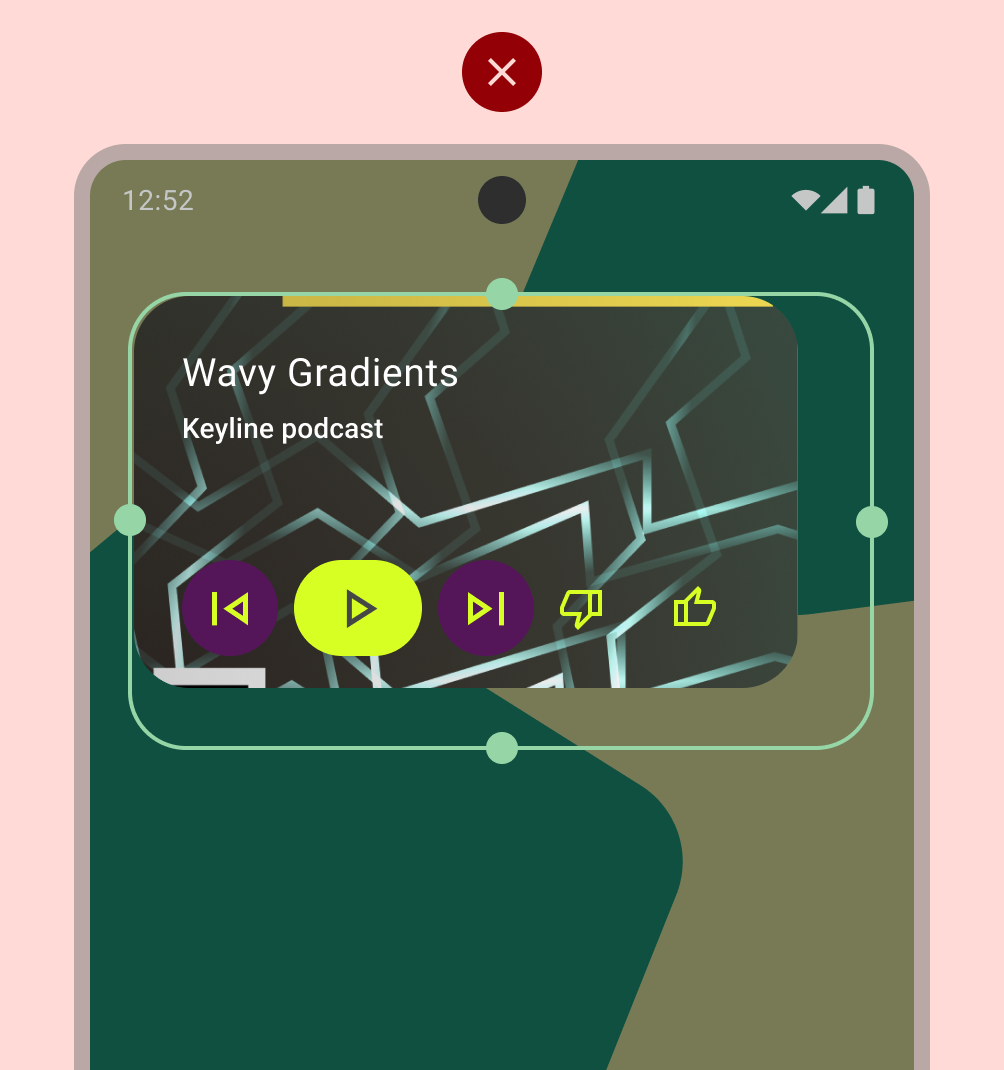 विजेट, वर्टिकल या हॉरिज़ॉन्टल ऐक्सिस पर होम स्क्रीन के अन्य एलिमेंट के साथ सही तरीके से अलाइन हो. साथ ही, विजेट के लिए ज़रूरत से ज़्यादा जगह न होनी चाहिए.